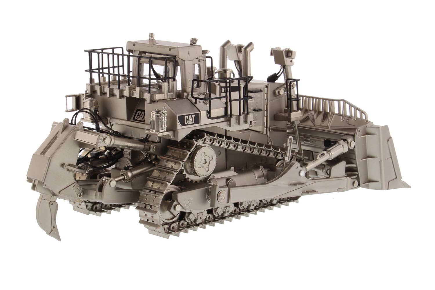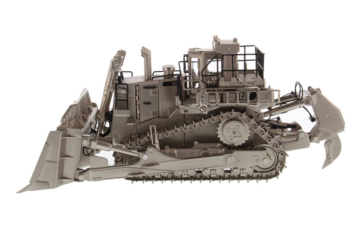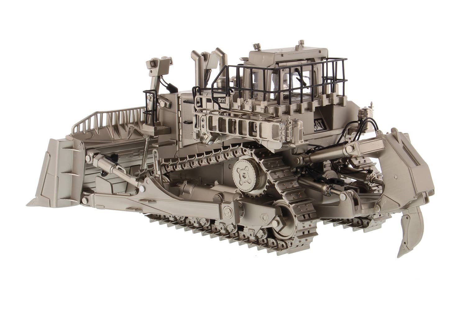 If you collect scale-model construction equipment, here's something truly special -- a Caterpillar D11T bulldozer finished with matte silver plating! The D11T is equipped with a single-shank ripper in back, and carries a V-type 12-cylinder 32-liter twin turbocharged diesel engine. It's used all over the world due to its relitable and stable performance and excellent operability.