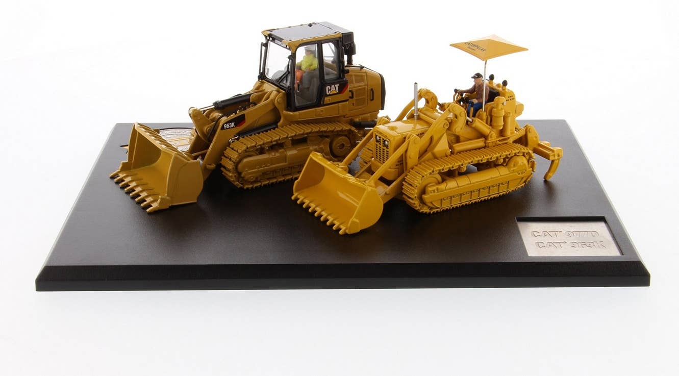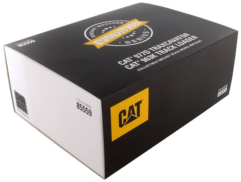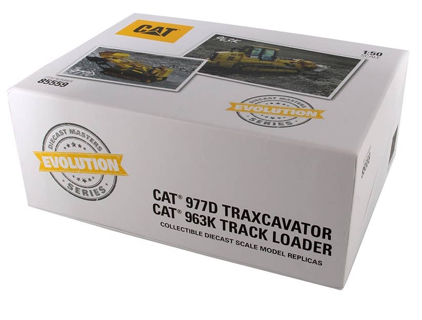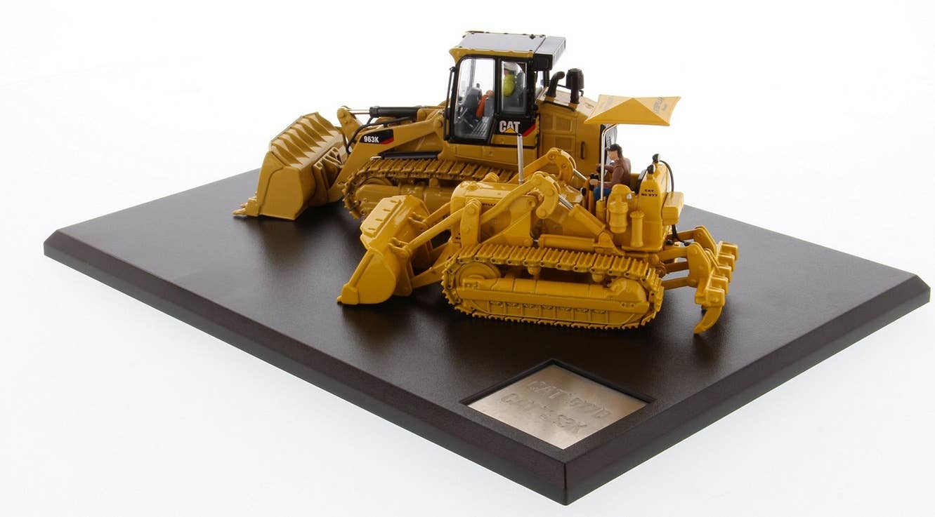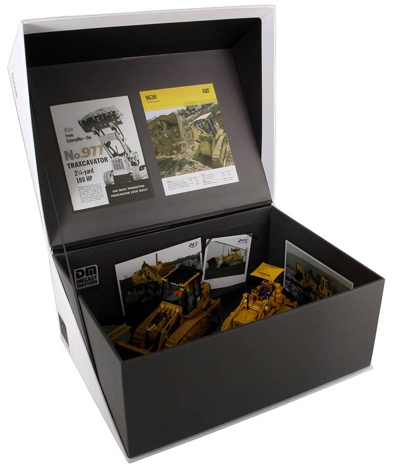 Evolutions series models, like this set of 977D and 963K Track Loaders, are mounted on special bases and placed in quality flip-top packaging, protected by a black outer sleeve. A full-color booklet, included with the models, traces machine evolution in words and pictures.