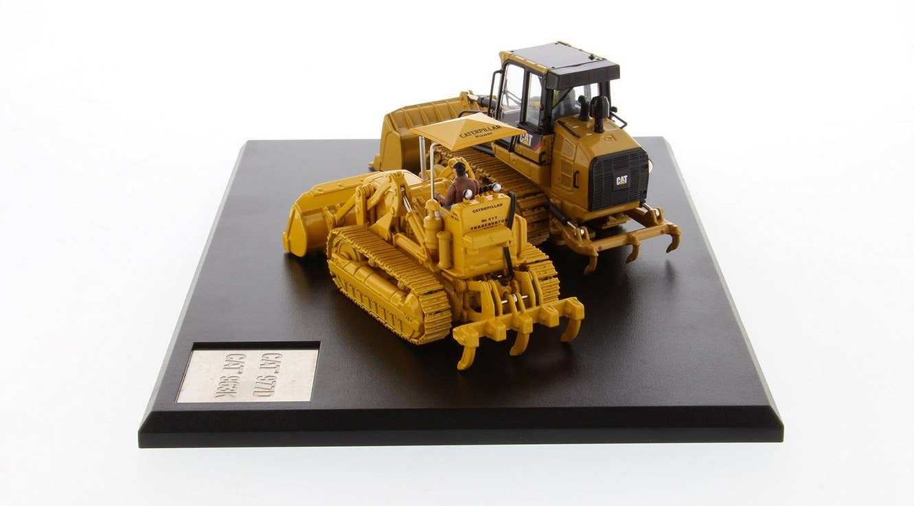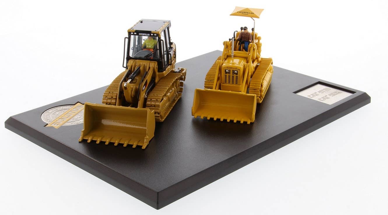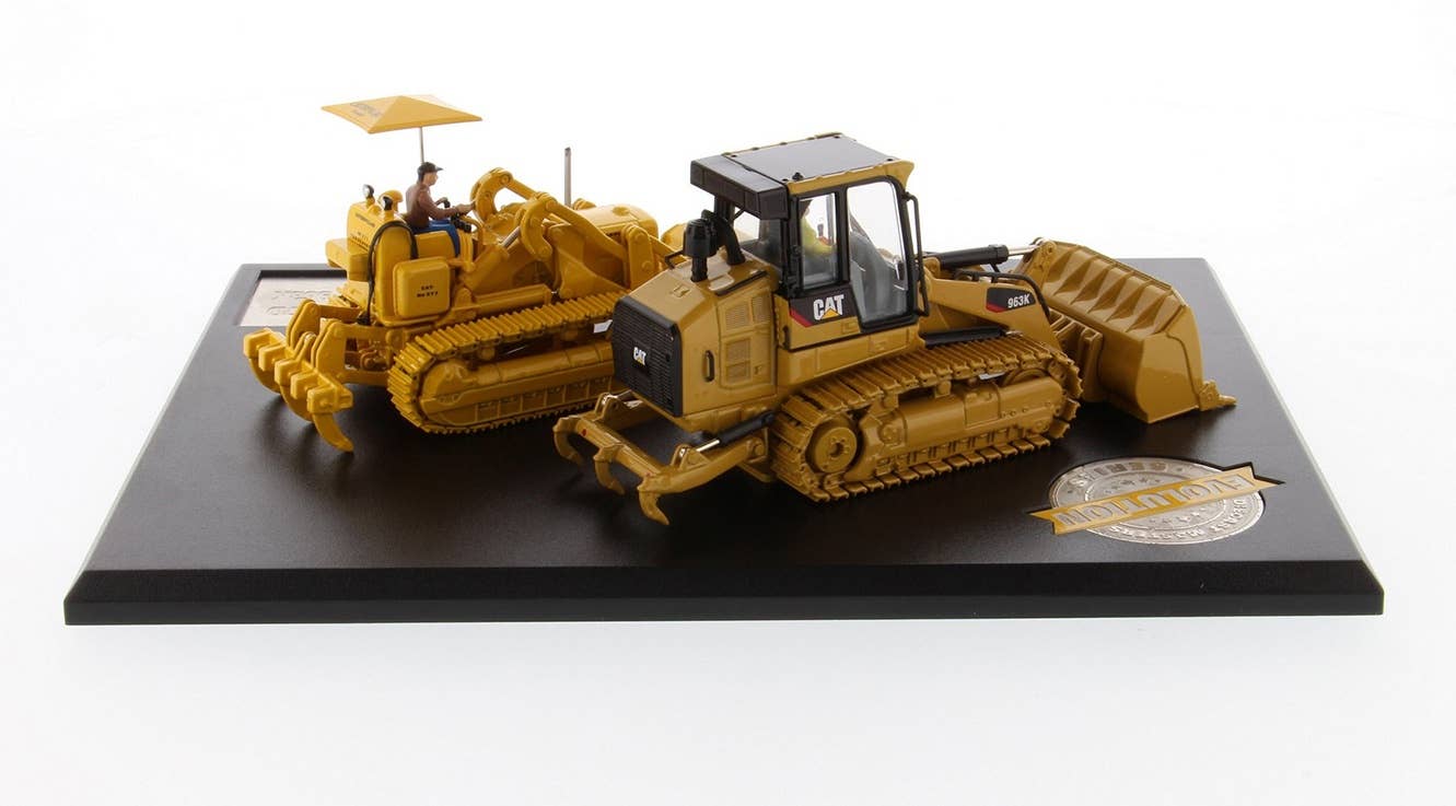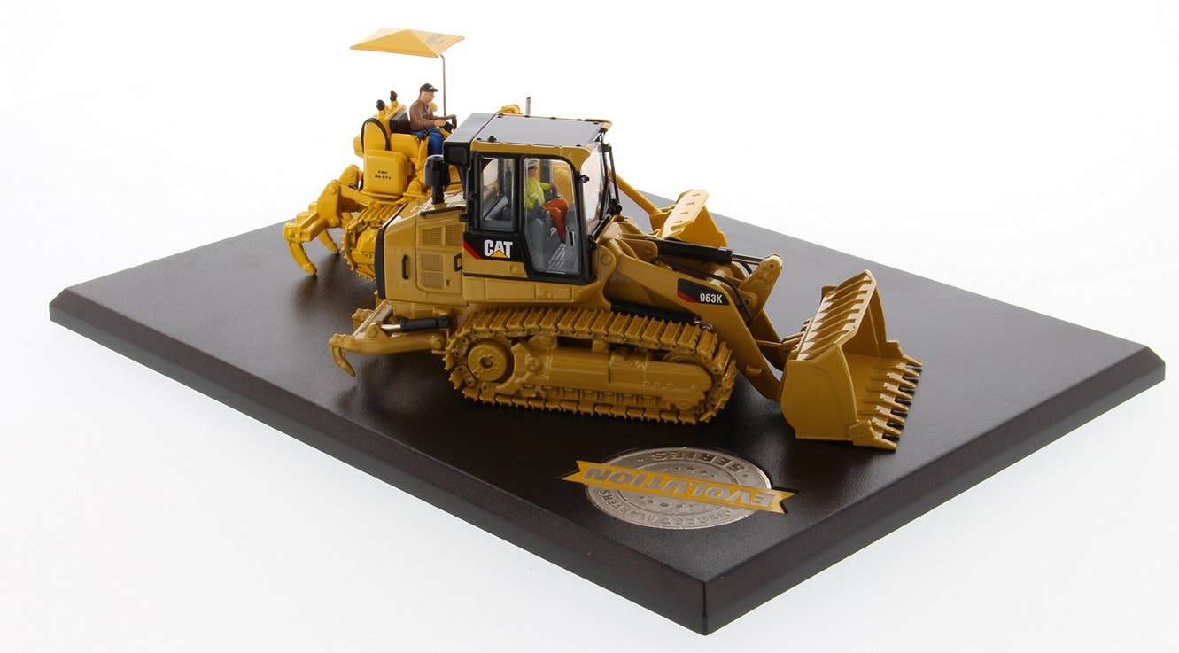 Evolutions series models, like this set of 977D and 963K Track Loaders, are mounted on special bases and placed in quality flip-top packaging, protected by a black outer sleeve. A full-color booklet, included with the models, traces machine evolution in words and pictures.