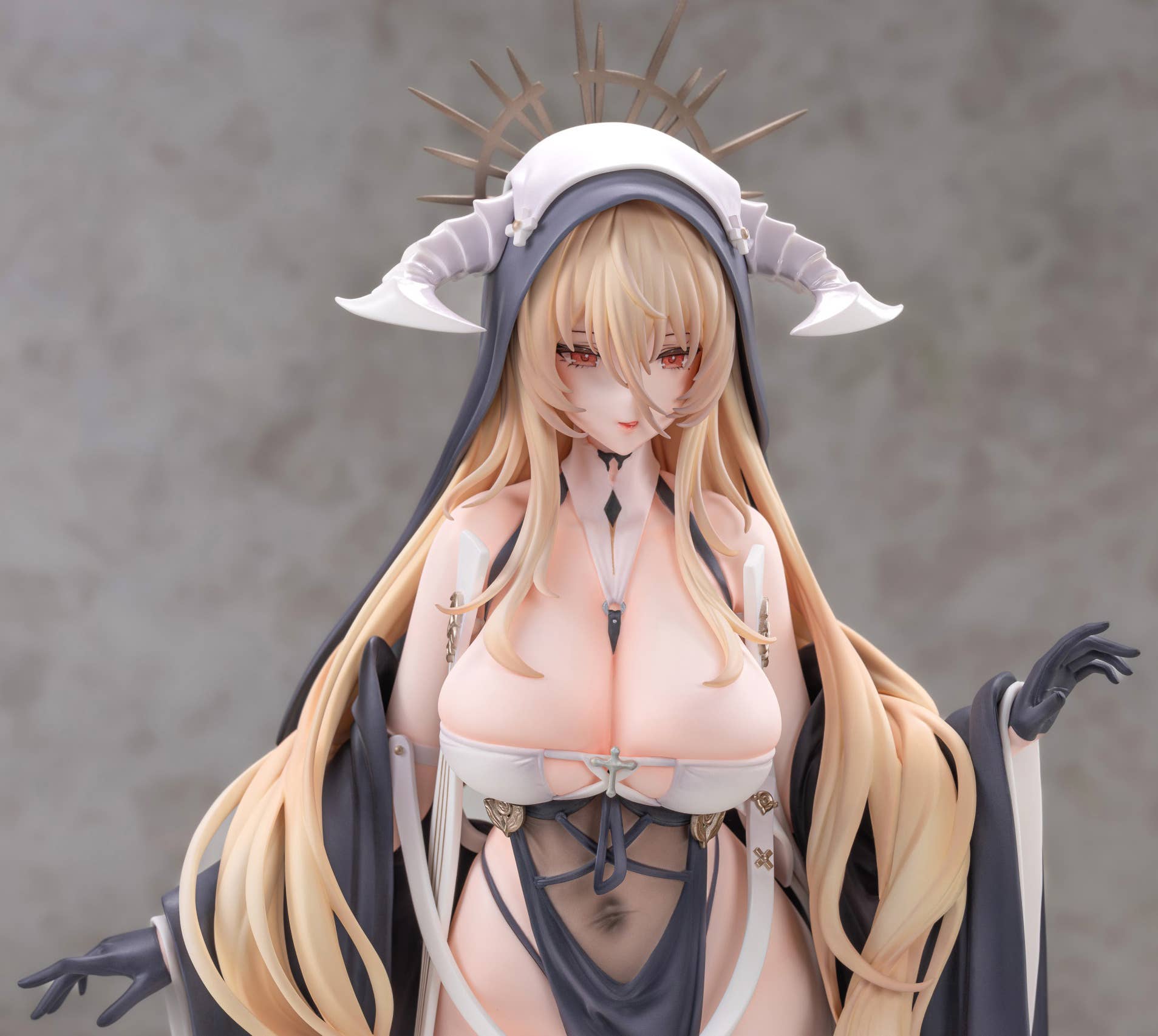 Implacable, an aircraft carrier from "Azur Lane," gets a gorgeous new figure from AniGame! Her outfit combines aspects of a nun's habit with Art Deco influences, resulting in a surprisingly elegant presentation! Her wimple headdress can be removed, and replacement parts allow you to display her without the fabric drape across her stomach, too. A base is included. Accept her blessings, Commander, and order her for your own collection today!