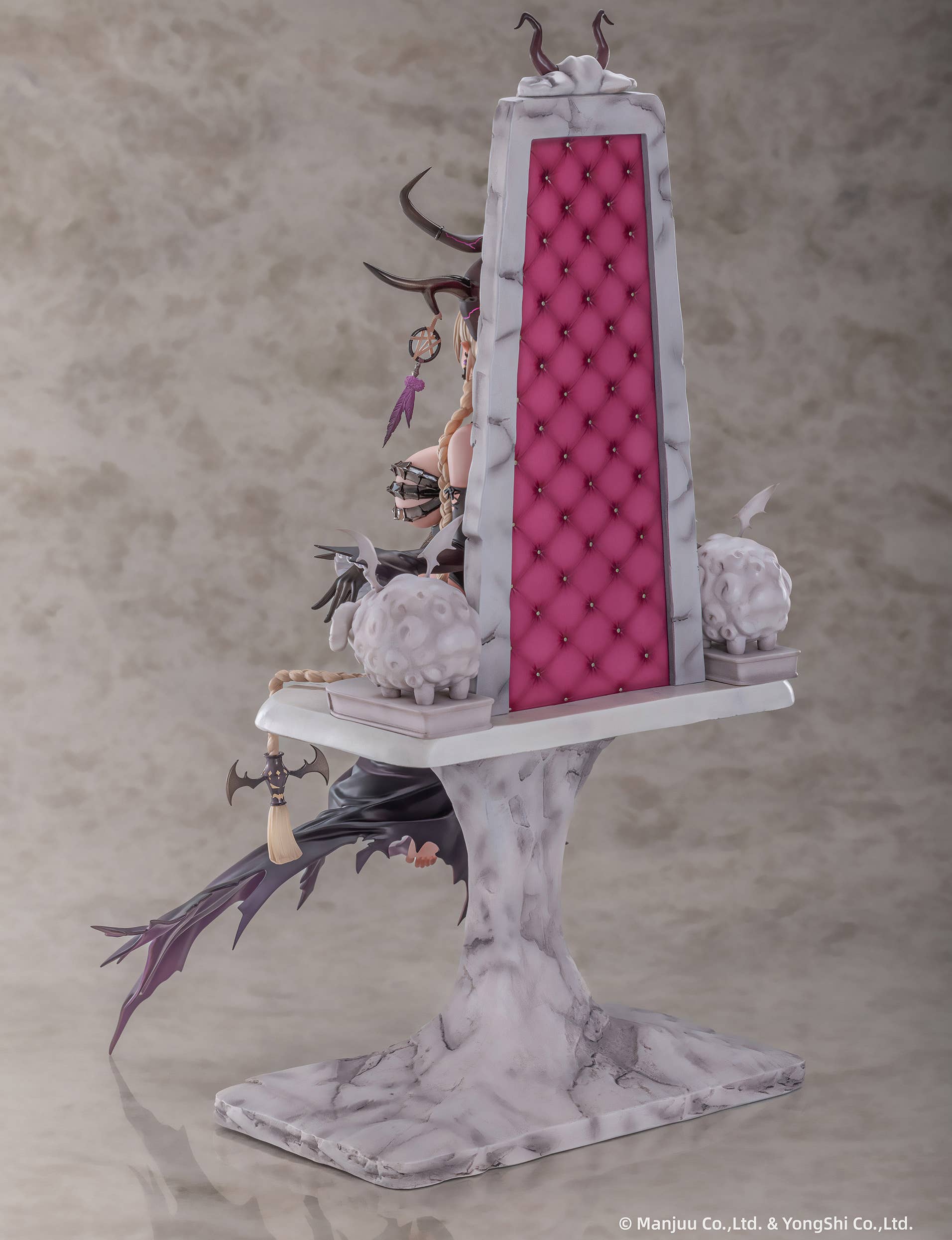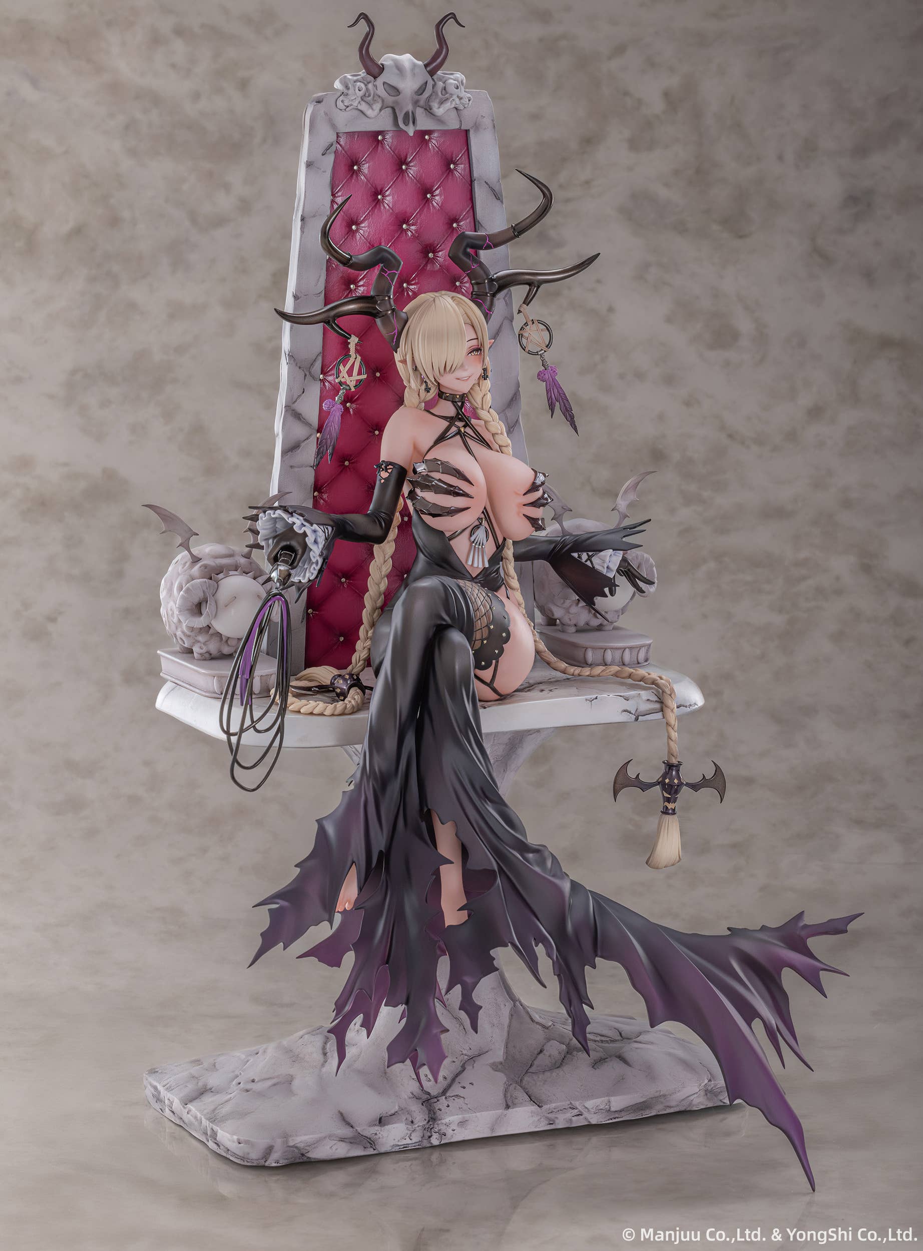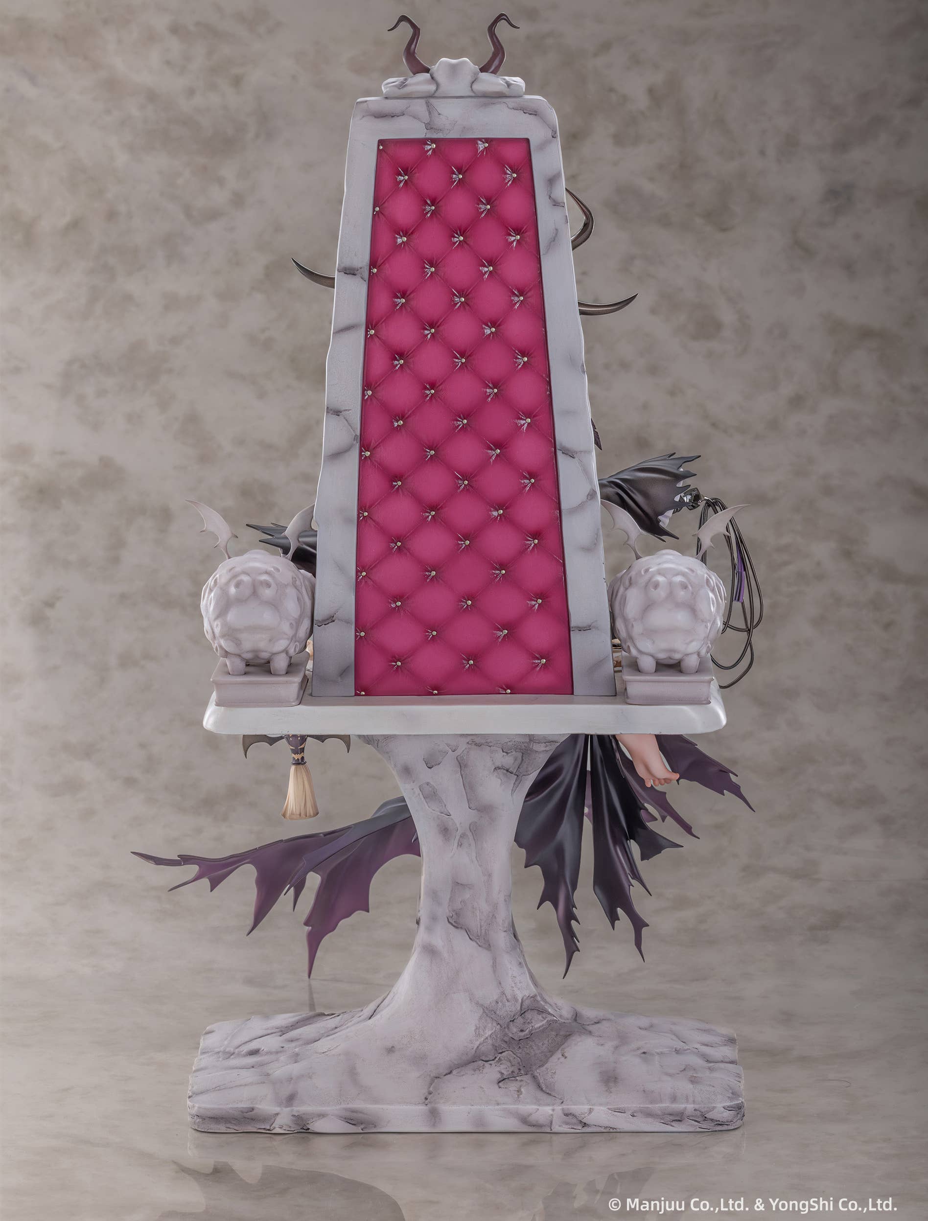 Owari from "Azur Lane" gets a new figure from AniGame that shows off her "My Wish is For Love" skin! She's sitting on an ornate throne, enjoying her status as the lord of the demons; her long tattered leggings sweep down to the base of the throne, and she regards you with a smile that's quite different from her typical somewhat vapid expression! This deluxe version of the figure includes a pair of interchangeable lower-body parts that can be swapped out to show off her bare legs without the fishnet stockings and flowing leggings; each one showcases a pair of strappy, super-high heels with bat wings. One lower-body part has her legs demurely crossed, while the other features her legs spread for a very alluring presentation! This figure is loaded with details, like the luxuriously tufted backrest of the throne, the ornaments Owari wears at the ends of her braids and on her horns, and the bat-winged sheep statues that form the throne's armrests. Order this deluxe set for your own collection today, Commander -- if you dare!