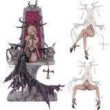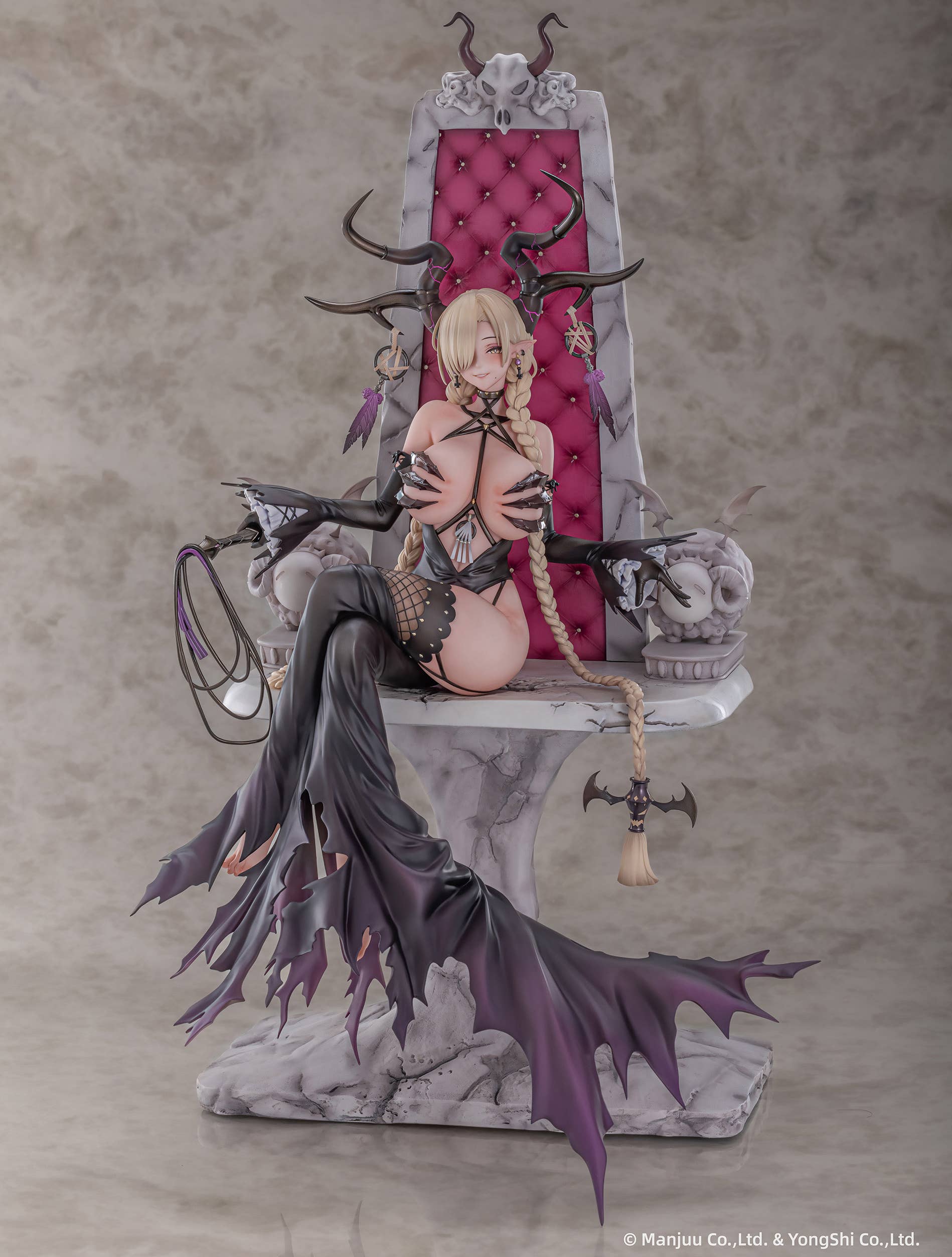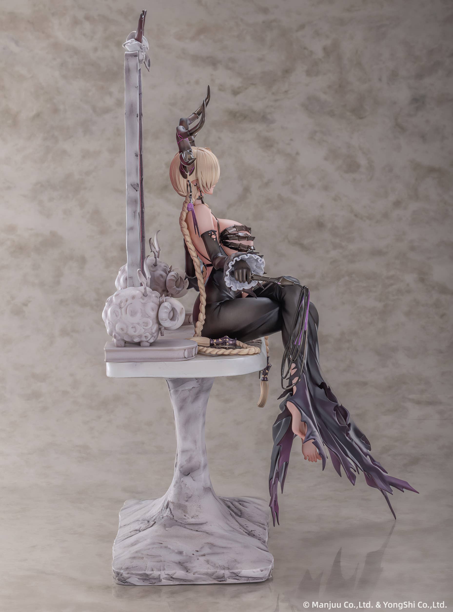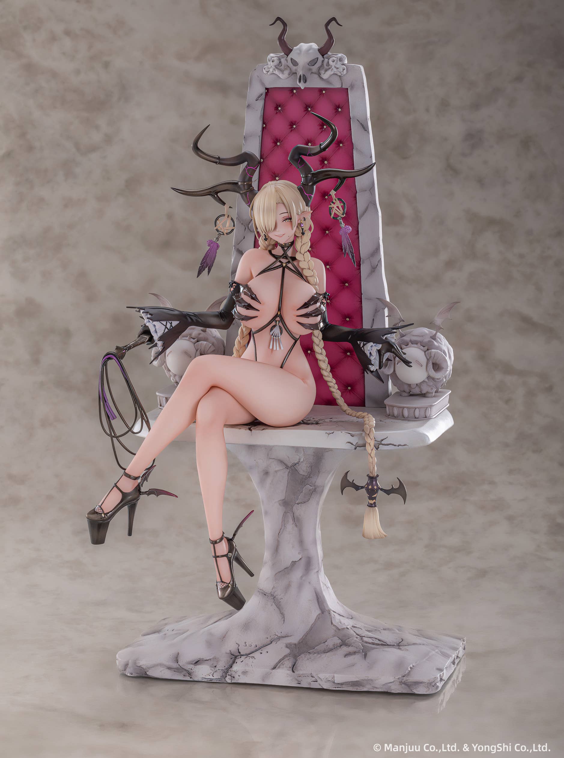 Owari from "Azur Lane" gets a new figure from AniGame that shows off her "My Wish is For Love" skin! She's sitting on an ornate throne, enjoying her status as the lord of the demons; her long tattered leggings sweep down to the base of the throne, and she regards you with a smile that's quite different from her typical somewhat vapid expression! This deluxe version of the figure includes a pair of interchangeable lower-body parts that can be swapped out to show off her bare legs without the fishnet stockings and flowing leggings; each one showcases a pair of strappy, super-high heels with bat wings. One lower-body part has her legs demurely crossed, while the other features her legs spread for a very alluring presentation! This figure is loaded with details, like the luxuriously tufted backrest of the throne, the ornaments Owari wears at the ends of her braids and on her horns, and the bat-winged sheep statues that form the throne's armrests. Order this deluxe set for your own collection today, Commander -- if you dare!