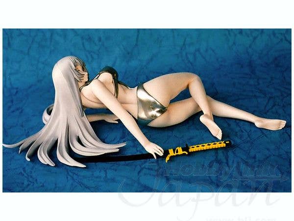Relaxing on her side in a shiny silver swimsuit, Choun Shiryu from "Ikki Tousen" still keeps her hand on her sword--a girl can never be too careful! This lovely prepainted coldcast display figure from Musashiya is about 28cm long; the upper part of her swimsuit can be removed for a really stunning view of this lithe and lovely warrior. Limited quantities are available--order her today!