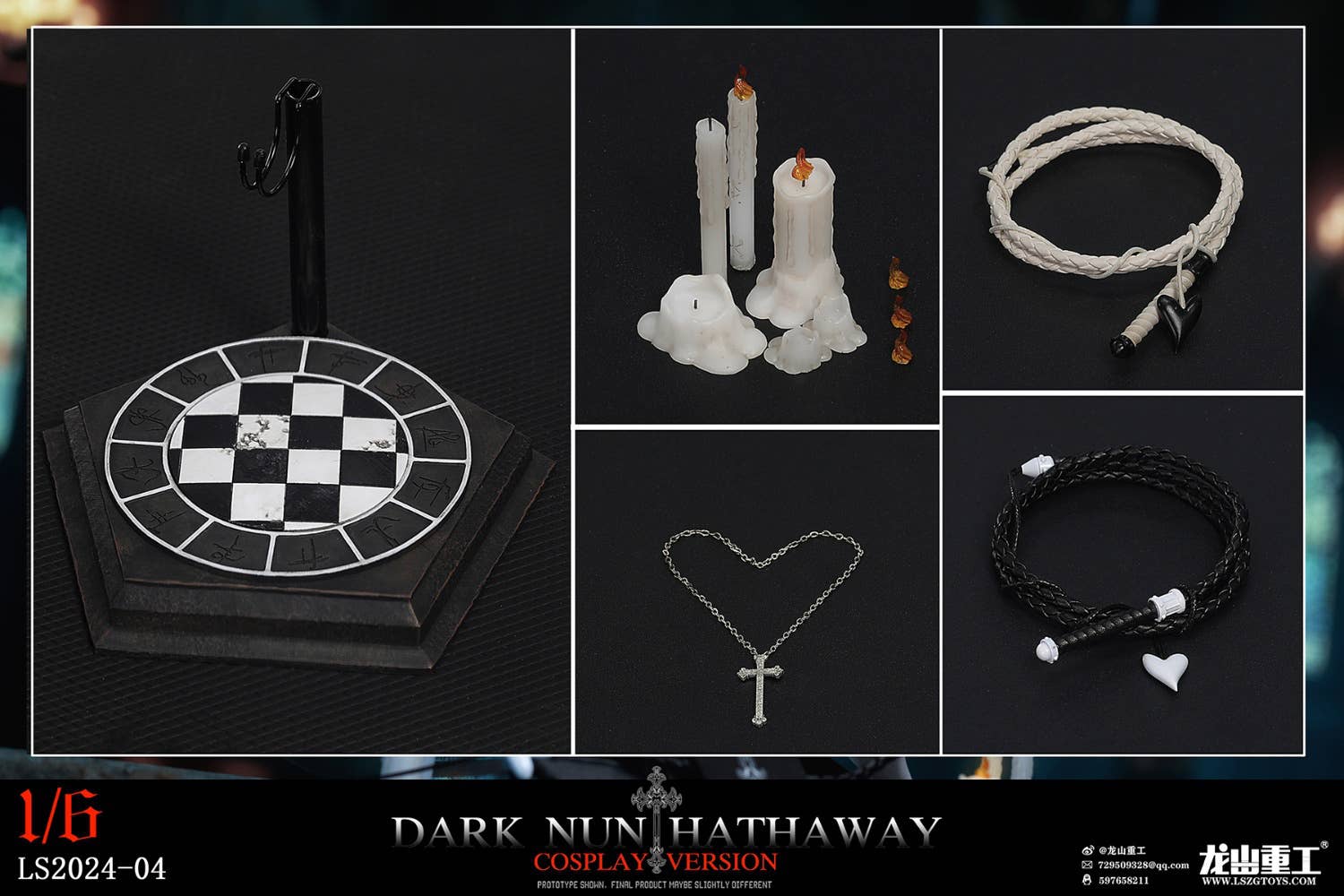 Dark Nun Hathaway is an original character from Long Shan -- she's a sexy, cool sister who wields the whip of love! This incredible 1/6-scale action figure is incredibly posable for maximum action, and she comes with an outstanding costume set and great accessories. This deluxe version includes two interchangeable heads, plus a set of five candles as an additional accessory! She'll be an amazing addition to your collection -- place your order today!