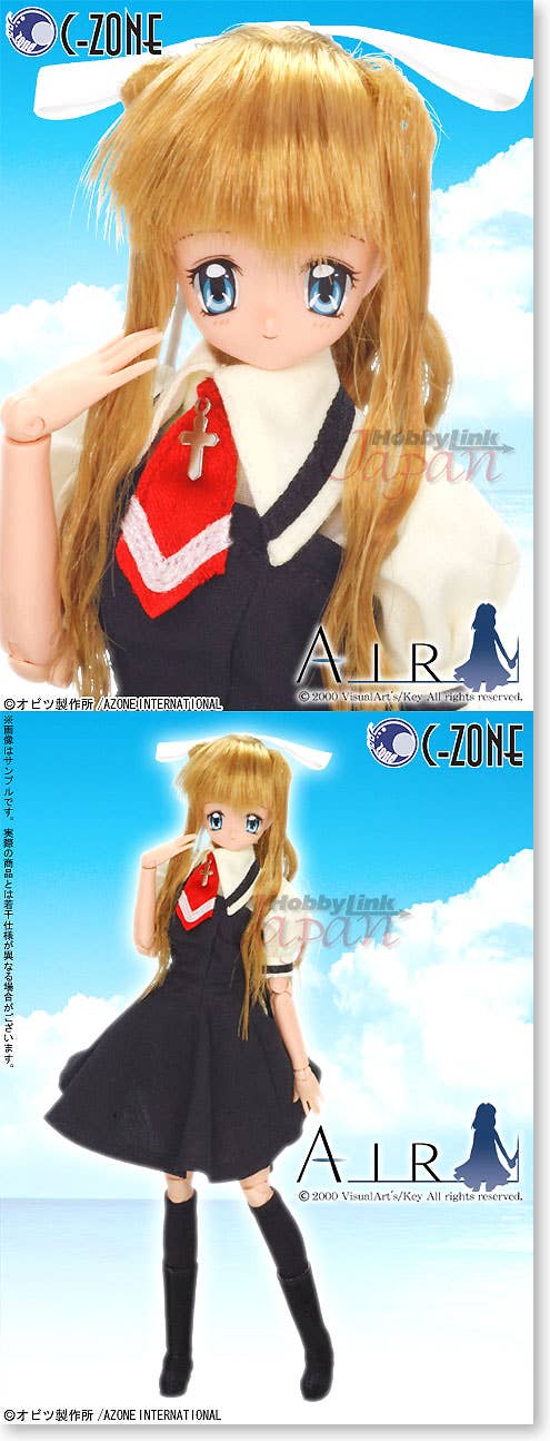 Lovely 1/6 scale articulated Azone doll of Kamio Misuzu, lead female character from the "Air" anime series, comes dressed in her usual school uniform made of fabric and comes with a figure stand to keep her upright.