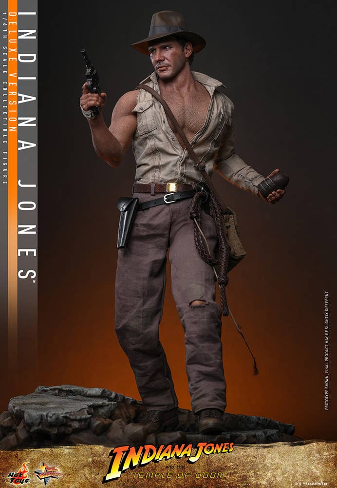 The costume is finely tailored to replicate his on-screen appearance, featuring a one-sleeved shirt and trousers with weathering and distressed effects for a rough-and-ready look. The outfit includes a fabric belt, a genuine leather belt with a holster, and a pair of boots. Additionally, a red cord is included for his shirtless look. The figure is equipped with an array of weapons and accessories, including a genuine leather whip, a spear, a machete, a revolver, a crossbody bag, a Sanskrit manuscript, and two sets of Sankara Stones (in both dormant and activated states). The Deluxe Version features a newly designed skull altar-themed diorama base that can hold the Sankara Stones, along with roped planks at the back, allowing for various dynamic displays.