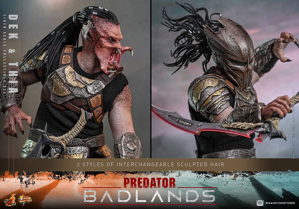 Hot Toys now brings us a 1/6-scale collectible action figure of Dek together with Thia! The figure of Dek features a newly developed head sculpt with separate rolling eyeballs, two interchangeable mandibles, and two interchangeable hairstyles. Dek's armor is intricately detailed with worn metallic textures, layered over a tunic. He comes armed with a foldable plasma sword and a plasma sword in its folded state, as well as a foldable bow and arrow that can be magnetically attached to his back. He's also equipped with two shurikens, along with dual wristblades for a formidable combat stance. A wearable bio-mask and a sand-themed figure base complete his imposing look.