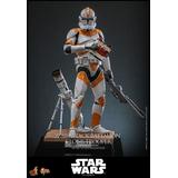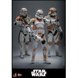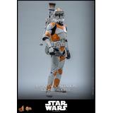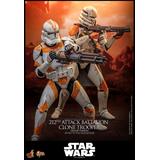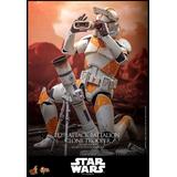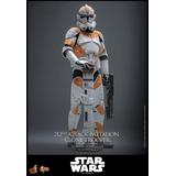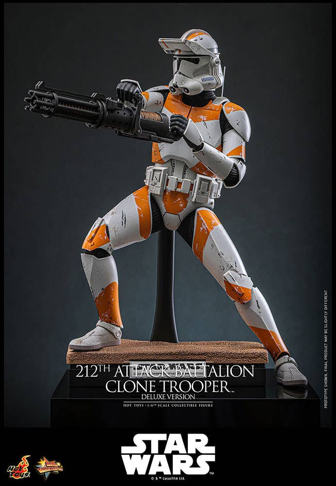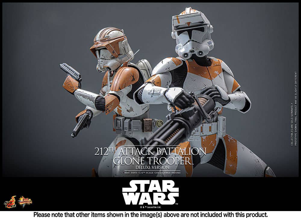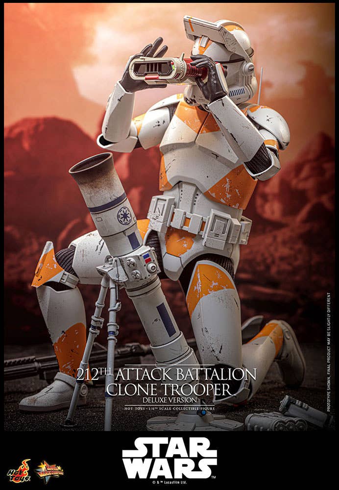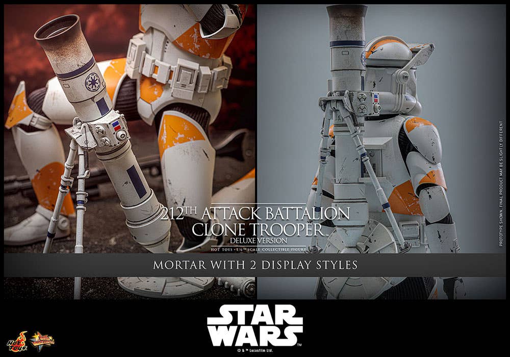 Hot Toys brings us the Deluxe Version of their new 1/6-scale 212th Attack Battalion Clone Trooper figure -- a release with additional accessories to enhance display options. This Deluxe Version includes two finely crafted interchangeable helmets, as well as a set of weathered white armor accented with the unit's signature orange markings, paired with a utility belt and boots. To prepare the Clone Trooper for any mission, weapons such as a DC-15A blaster rifle and DC-15S blaster carbine are included. The Deluxe Version also offers extra heavy weaponry, including a Z-6 rotary blaster cannon and a mortar that can be attached to the trooper's back. In addition to the macrobinoculars, this Deluxe release features helmet macrobinoculars to enhance display options. Accessories include newly developed