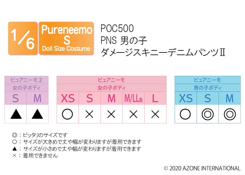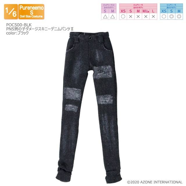 These boy-style skinny jeans are the perfect casual wear for your favorite Pure Neemo doll! Shoes shown are not included. This accessory is intended for Pure Neemo dolls by Azone. Please check the compatible body sizes below before placing your order.
