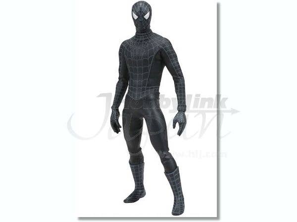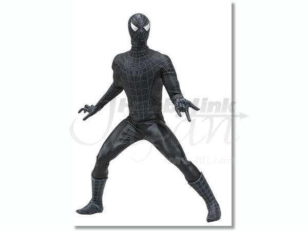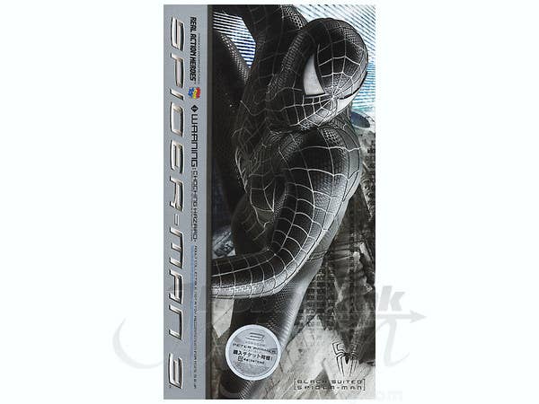 "Spider-Man 3" has finally hit the big screen, setting a new three-day weekend opening box-office record! Medicom Toys joins in on all the fun with this superb 1/6-scale fully articulated figure of Spidey in his new super-cool black suit. Why is his new suit black, you may ask? Well, you're just gonna have to check out the movie and see for yourself! This 30cm figure features faithful detailing throughout, with a body suit made of special coated fabric to replicate the look and feel of the real Spidey suit. Web pattern is "dimensionally painted with puff paint," which means it stands proud of the suit fabric just like the real thing. Includes two extra hands for a variety of posing. The inner body is the new RAH-1 Kai, which provides for a wide range of articulation while maintaining Spidey's shape. Includes a figure stand to hold Spidey in all those arachno-crazy positions he's famous for! All in all, a very cool action figure from the masters at Medicom!