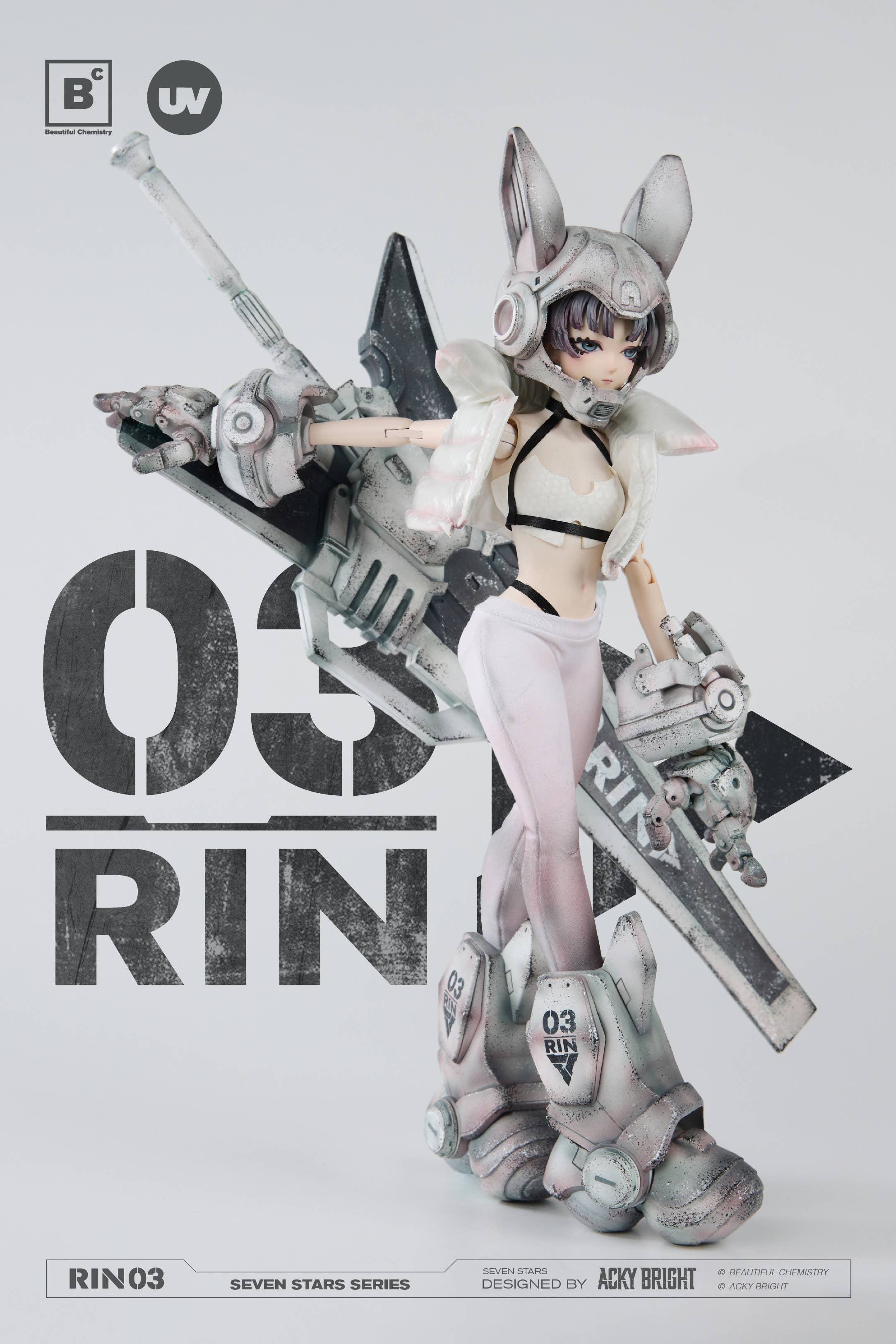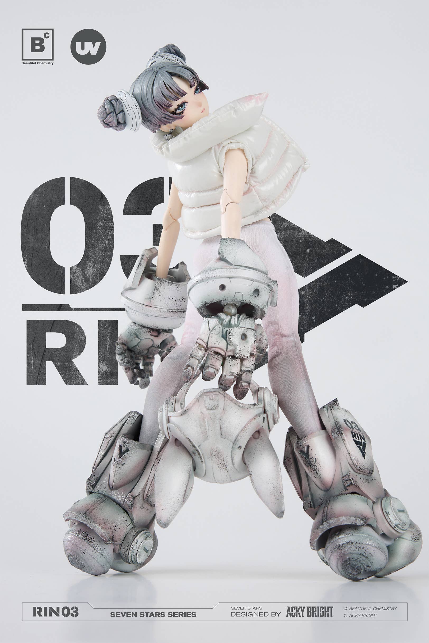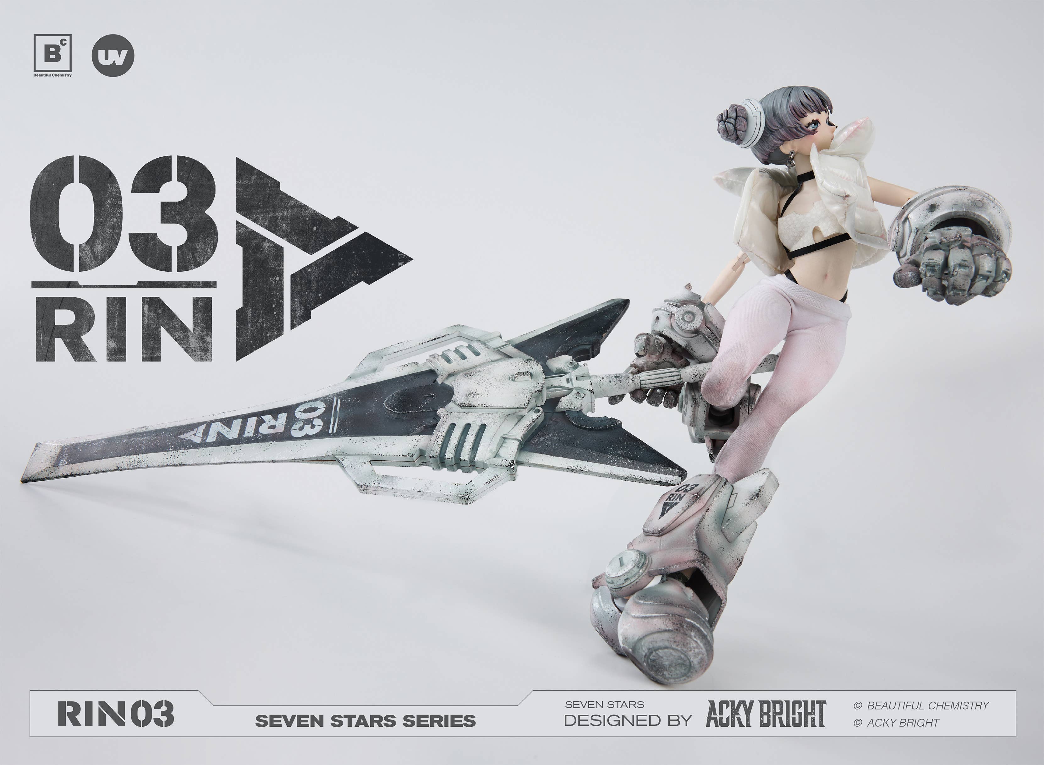 Beautiful Chemistry collaborates with the manufacturer Acky Bright to bring us No. 3 Rin, the third installment in their "Seven Stars" action-figure series! She's built on a body developed by UV (Underverse) with a total of 25 points of articulation. Her mechanical hands have movable fingers, and her mechanical legs have magnets built into her feet so she can be attached to her base. The mechanical legs are non-removable. Order her for your own collection today!