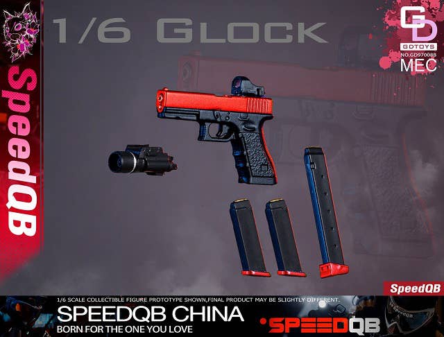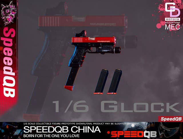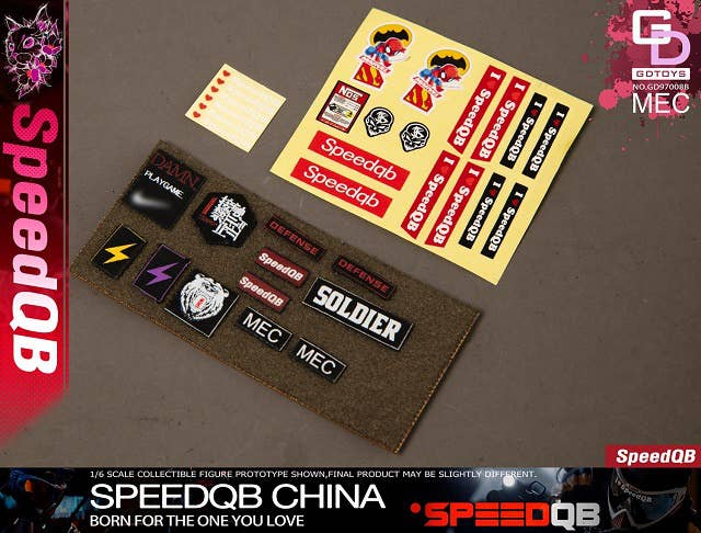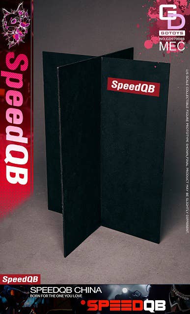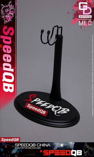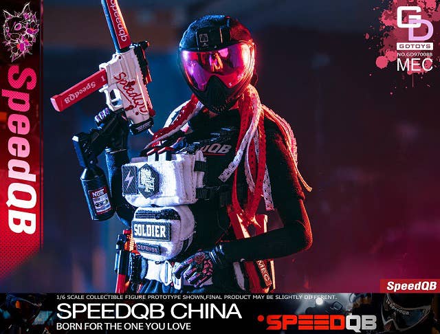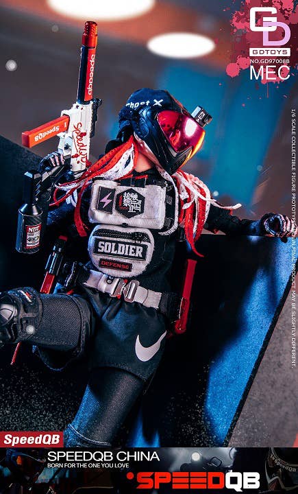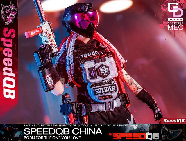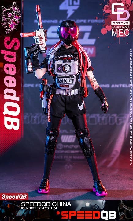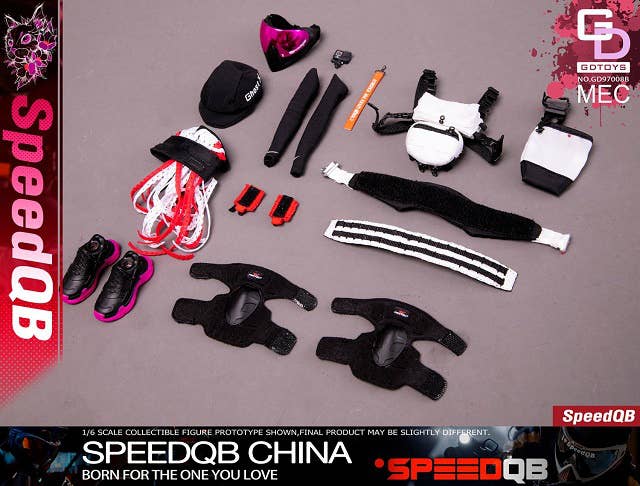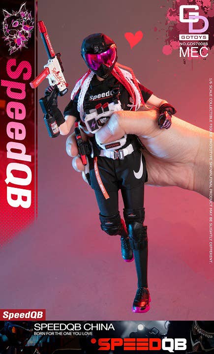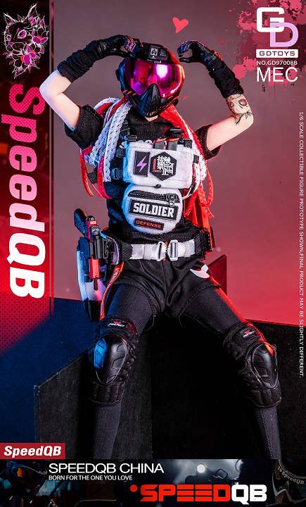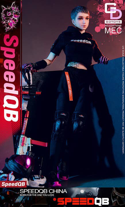 Head sculpture Seamless female body with exclusive tattoo patern Hands with colorful tactical gloves (x2 pairs) Black hat Colorful braided headband Goggles with motion camera Black short-sleeved hoodie Black sporty shorts Black tight-fit leggings Black protective sleeves (x1 pair) Tactical chest rig Tactical pouch Sundry pouch Equipment belt Mag pouch (x2) Pistol holster Black kneepads (x1 pair) Black protective leggings Black and fluorescent pink sneakers Red & black Glock pistol Tactical flashlight Tactical scope sight Pistol mags (x2) Extended pistol mag Red & white submachine gun Tactical scoper sight Tactical fore grip Submachine gun mags (x2 black, x2 red) Morale patches (x12) Stickers (x2) X-shape partition (x1 tall, x1 short) Figure display stand with Speed QB logo and nameplate Order her for your own collection today!