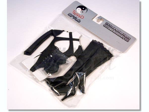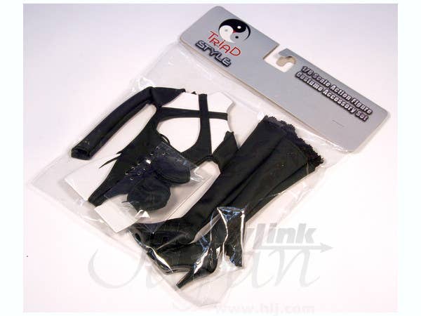 This detailed outfit, courtesy of Triad Toys, is amazing! A faux-leather long-sleeved leotard in deadly matte black laces up the front and zips up the back; a black bandeau bra and thigh-high, lace-trimmed boots with sky-high heels will make your doll into the most sultry spy ever! (The gun shown in the prototype photos is not included.) Made to fit 1/6-scale female action figure bodies by Triad, it is also compatible with most other 1/6-scale female action figure bodies, but please understand that it won't fit bodies by other manufacturers perfectly.