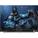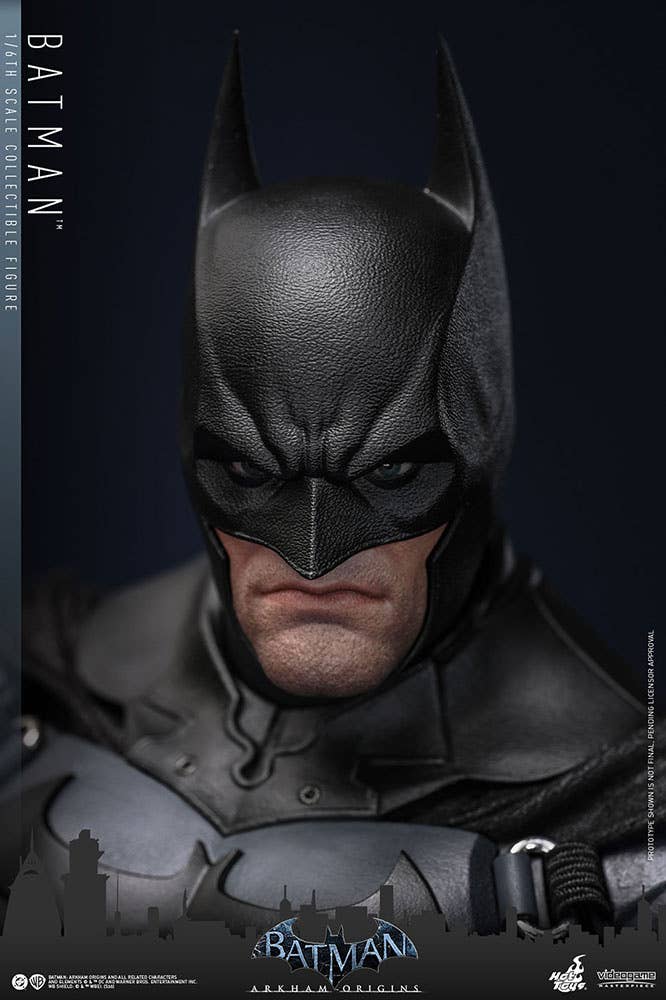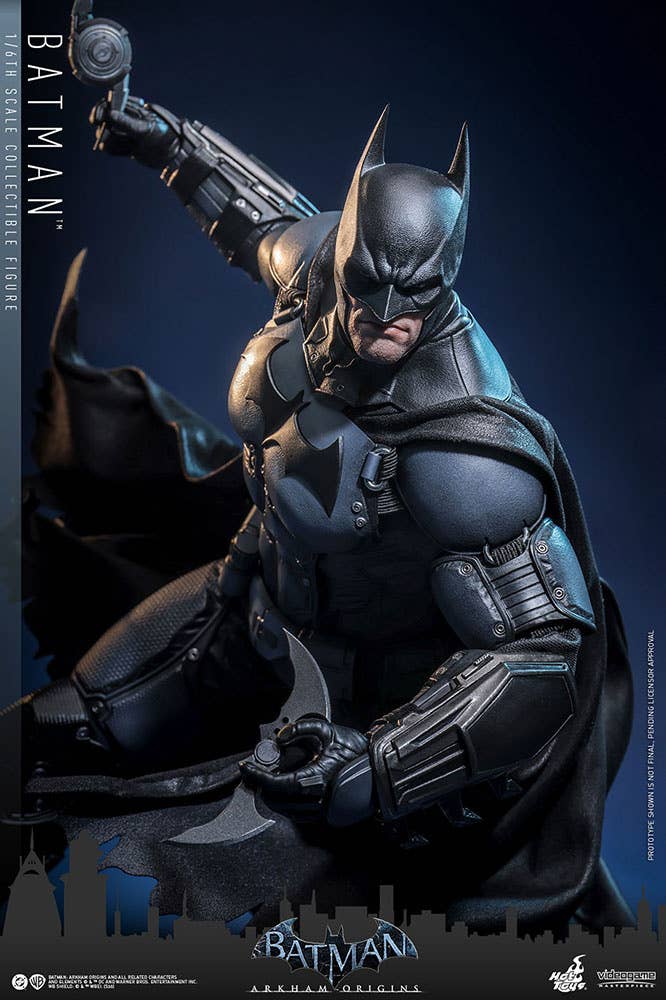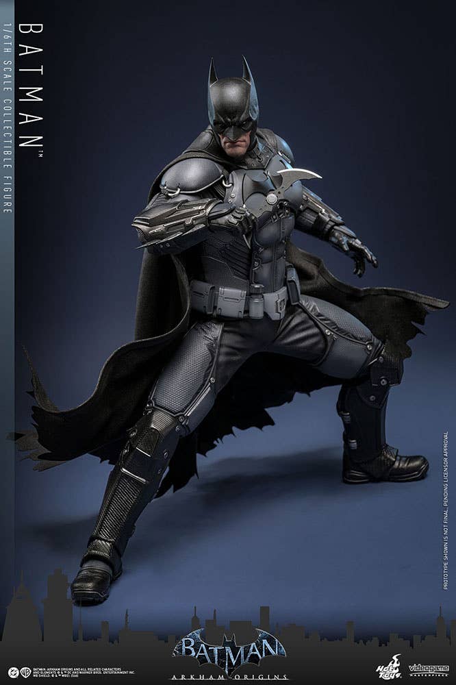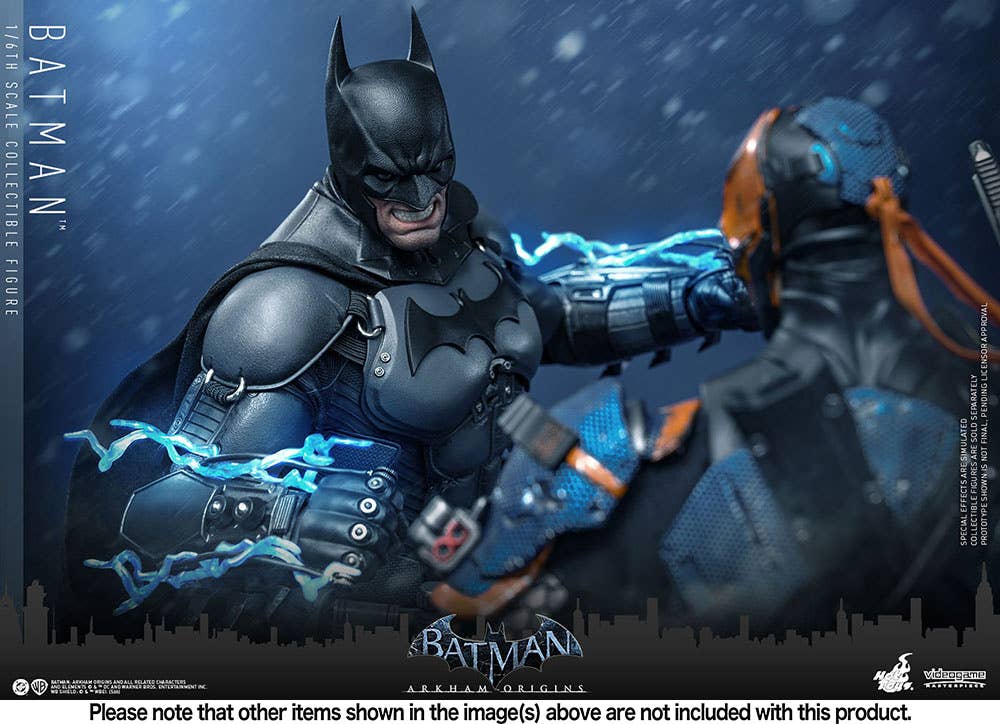 Hot Toys brings us their highly anticipated 1/6-scalke Batman collectible action figure from the video game "Batman: Arkham Origins"! This figure features a newly developed masked head with separate rolling eyeballs and two interchangeable lower face sculpts that showcase both his brooding look and a determined, clenched-teeth expression. The figure's costume is faithfully recreated according to the bulky and armored yet practical design seen in the game, featuring a newly developed Batsuit with gray-and-black full-body armor layered over an undersuit on the muscular body. A pair of Heavy Gauntlets, boots, a utility belt, and a wire-embedded cape complete his outfit. The figure also includes a pair of Shock Gloves armor plates that feature translucent blue lightning effects to showcase their electrified impact. Seven interchangeable hands are also included, such as fists, open gesture hands, and weapon-holding hands so collectors can display him in dynamic poses.