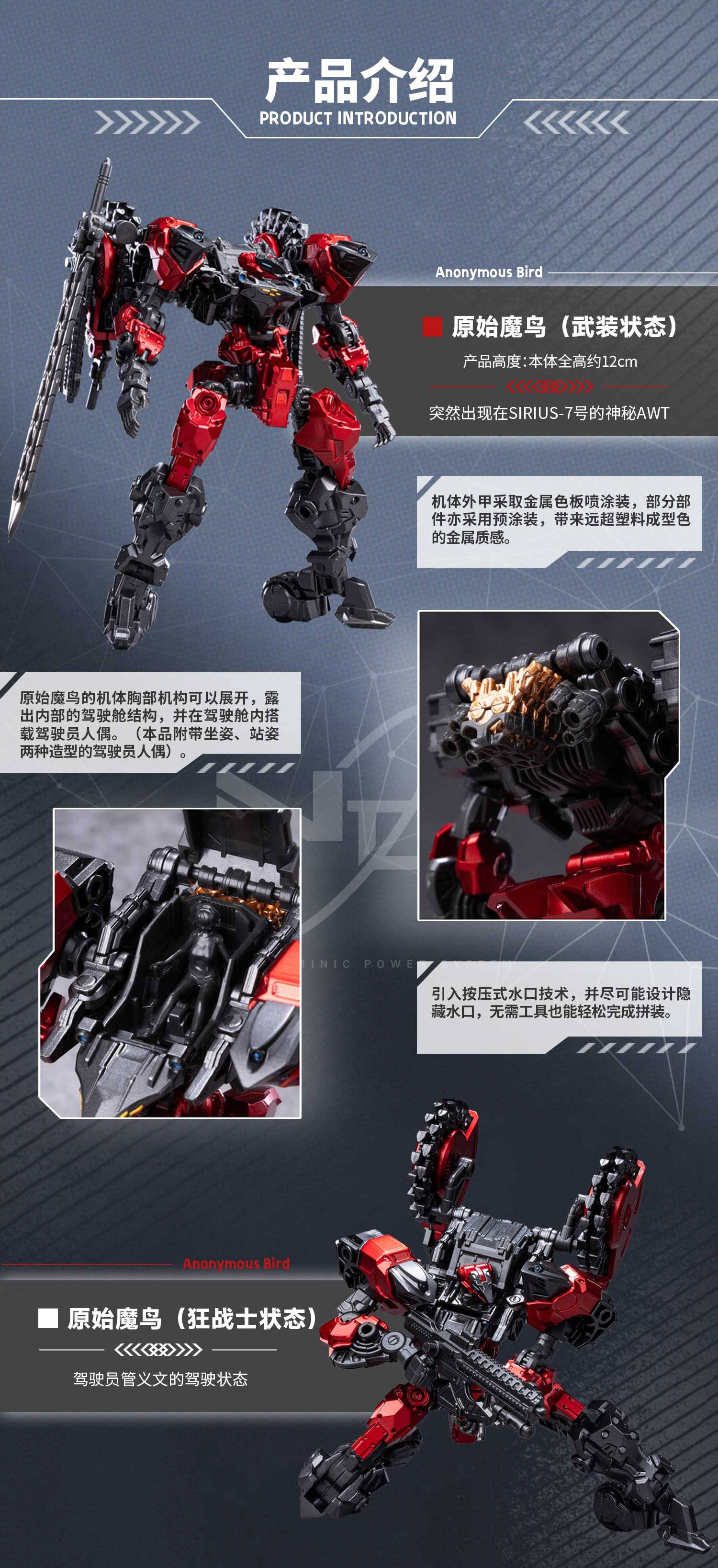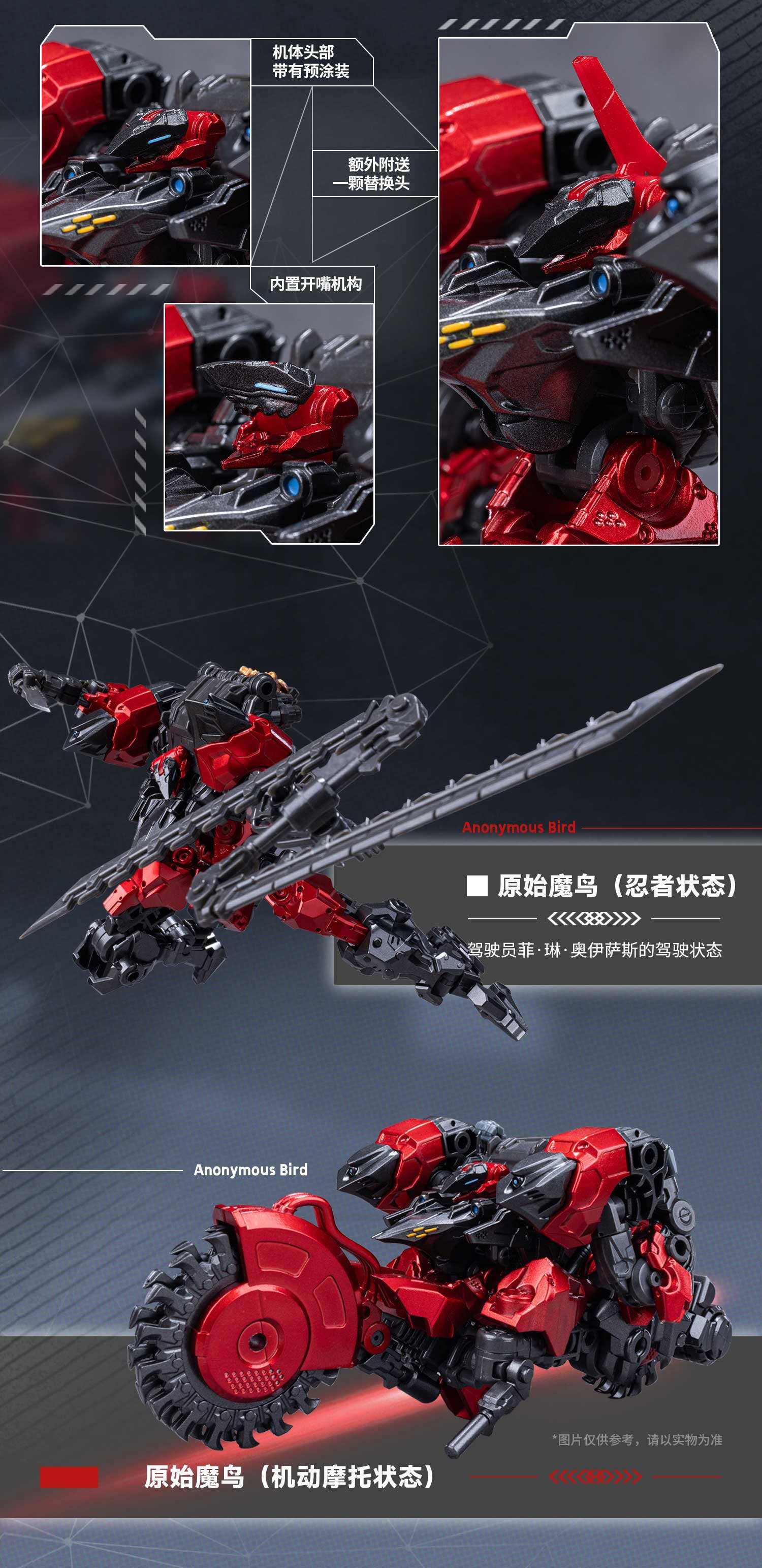 BigFirebird Build brings us a new 1/60-scale model kit of Anonymous Bird from the sci-fi manga "BIRD/BINARY Shade"! This unit is packed with gimmicks that allow it to transform into four different forms! The chest unit unfolds to reveal a cockpit, and a pilot figure can be placed inside; its unique weapons are included. Order it for your own collection today!