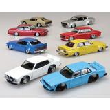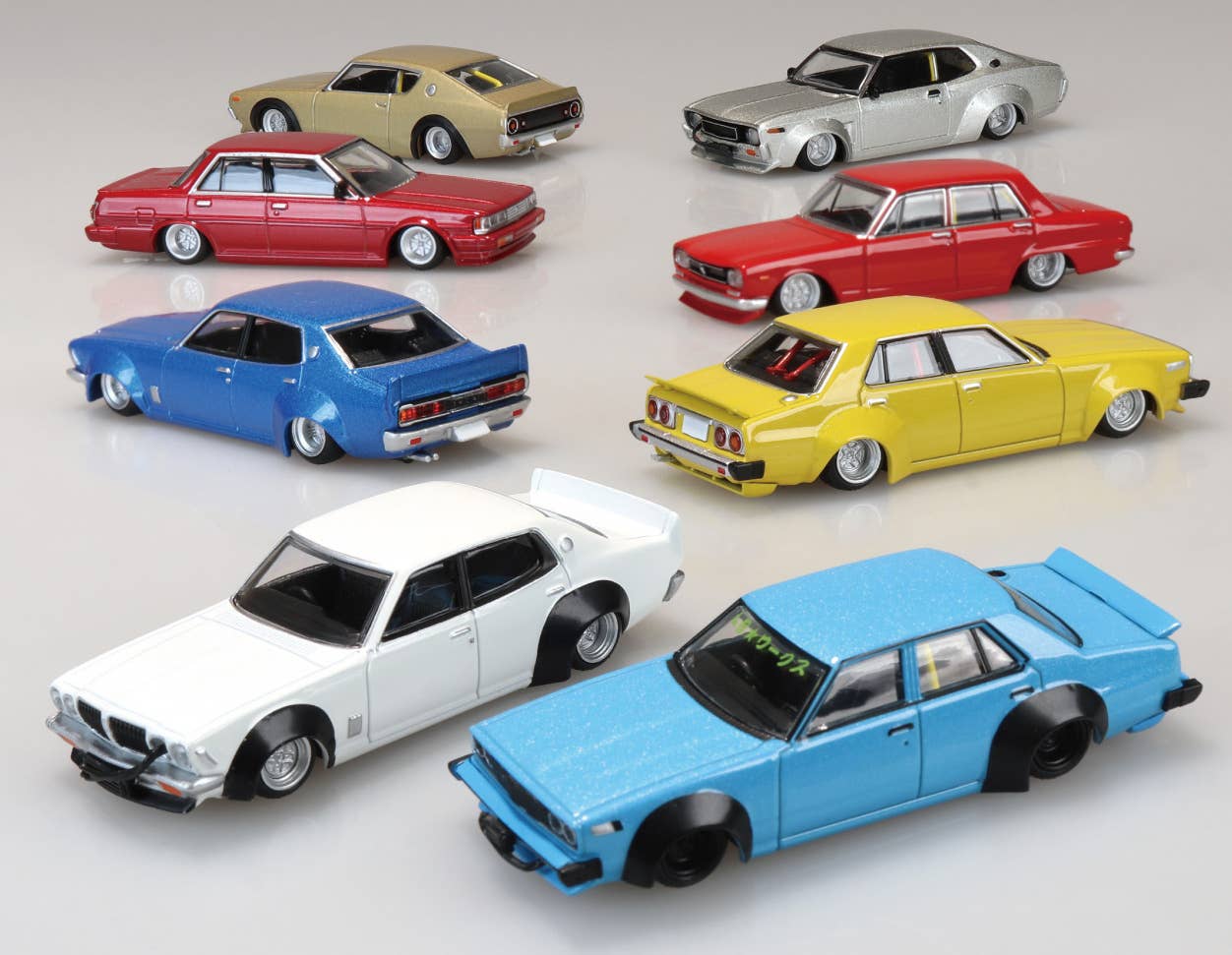 This is a series of gashapon (capsule toys) or trading figures depicting passenger cars.