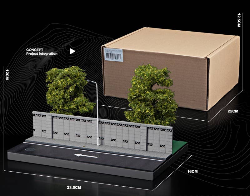 Diorama of a road along a wall and a green park