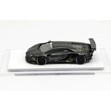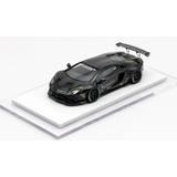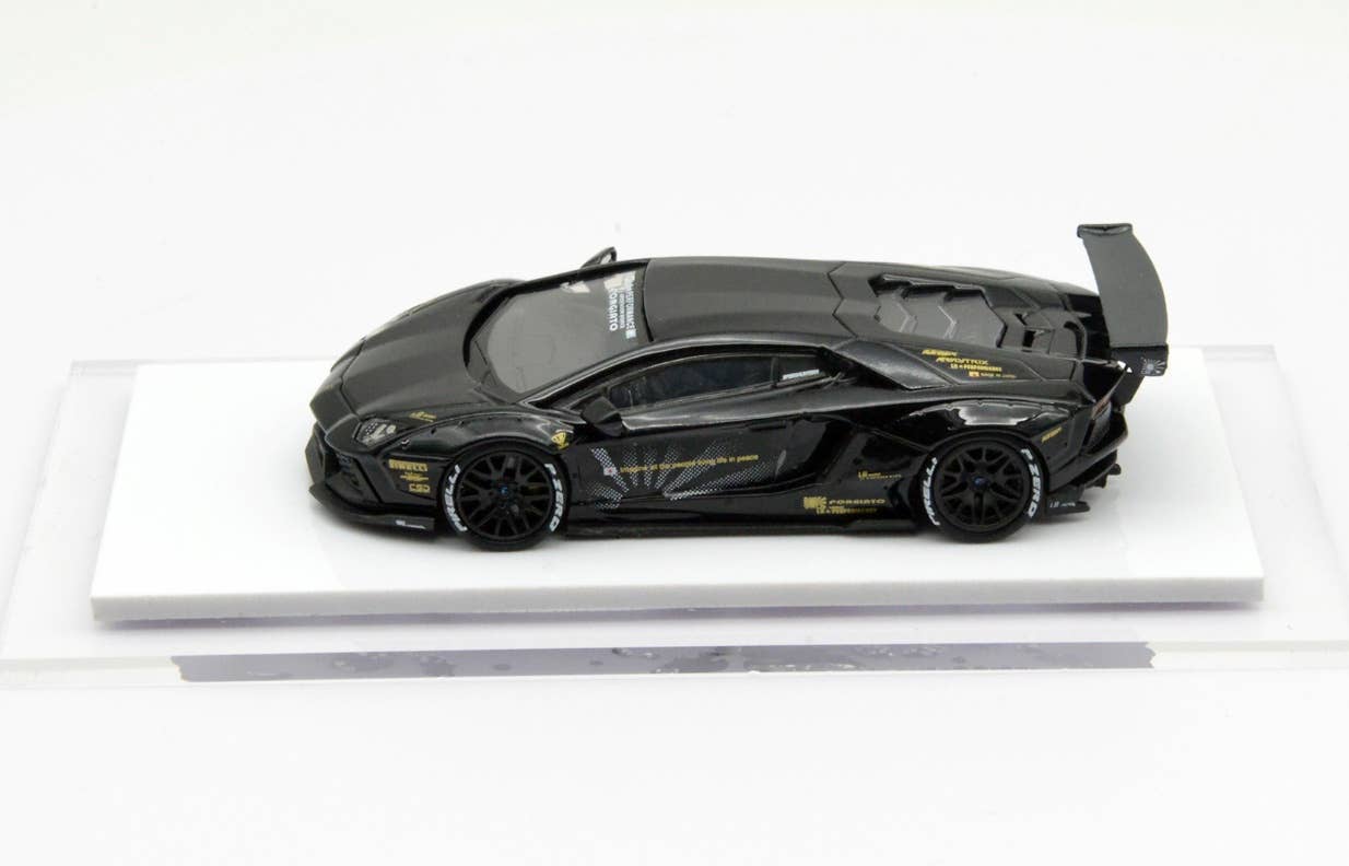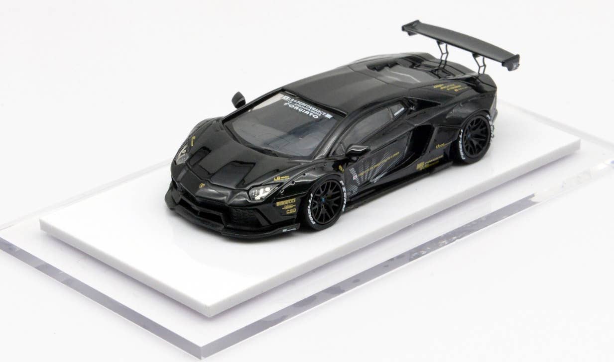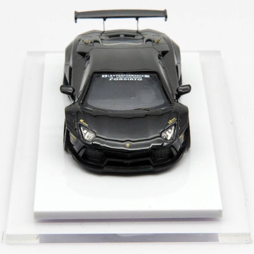 This is a fully assembled and beautifully finished model of the Liberty Walk LB-Works Aventador LP700 in black, mounted on a white plastic base with a clear plastic cover to keep it free of dust and fingerprints.