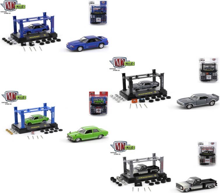 The latest model kit assortment from M2 Machines, featuring cars with removable and changeable wheels and tires, includes: