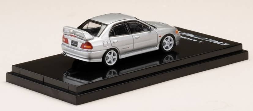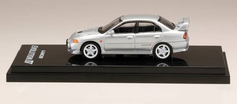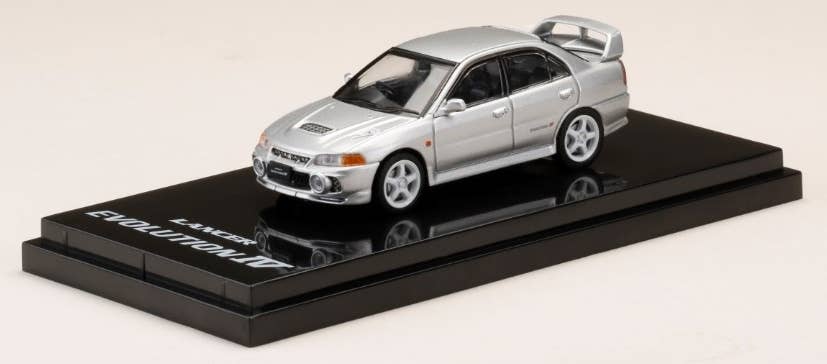 This completed die-cast alloy and ABS display model of the Mitsubishi Lancer RS Evolution IV is a replica of the second-generation Lancer Evolution, very different from the Evolution III. Its engine output has been increased to 280hp, and this custom specification includes wheels and muffler. Hobby Japan used 3D scanning to measure and shape the actual vehicle for this model! In spite of its small scale, it's detailed down to the intercooler, visible through the front mesh. Order yours today!