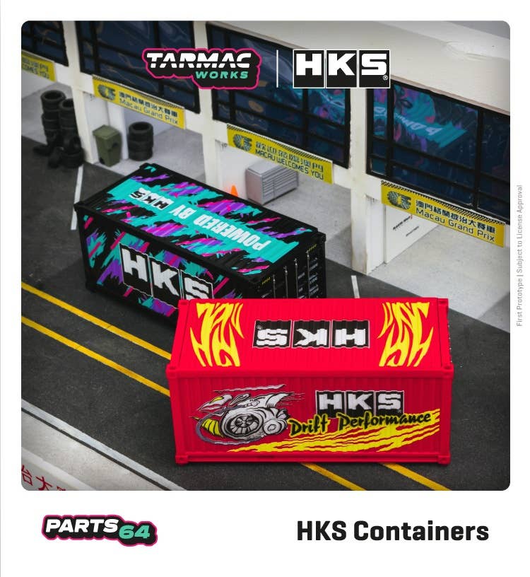This is a set of two 1/64 scale exclusive container spare boxes printed with the logo mark of "HKS", a well-known tuning engine manufacturer.
