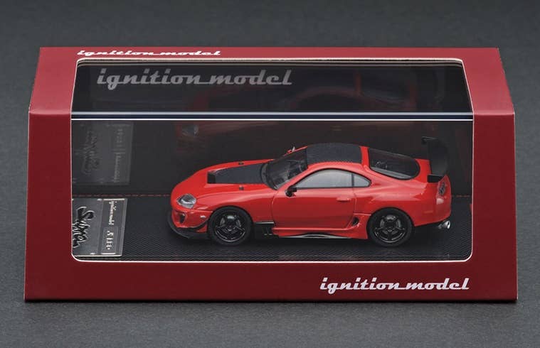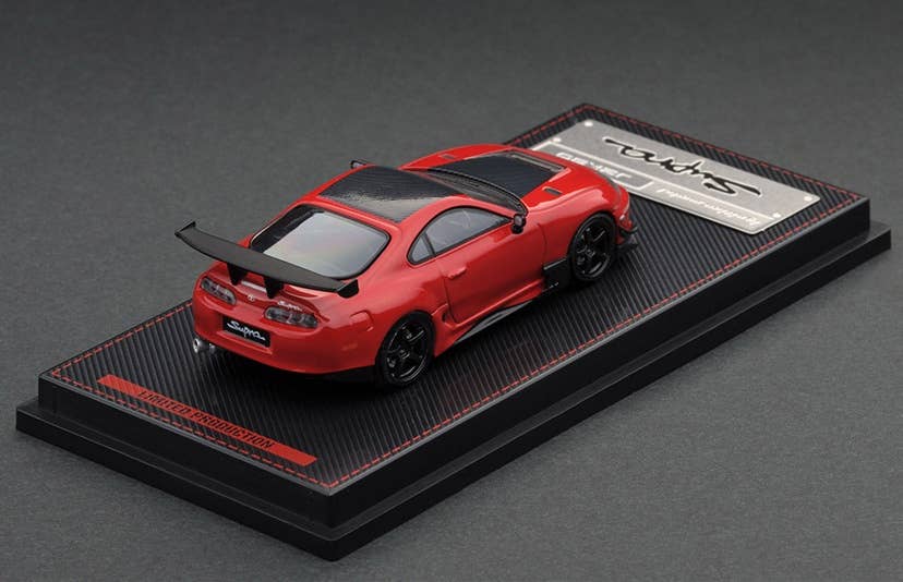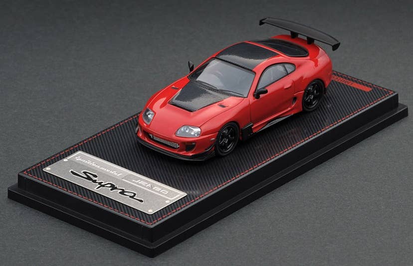 This is a fully assembled and beautifully finished model of the Toyota Supra JZA80, mounted on a black plastic base with a clear plastic cover to keep it free of dust and fingerprints.