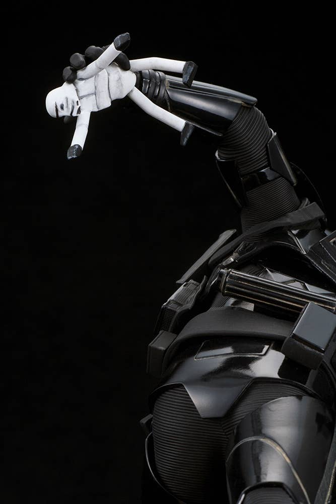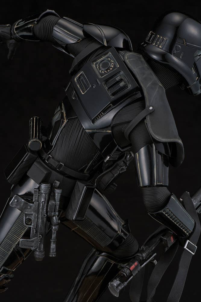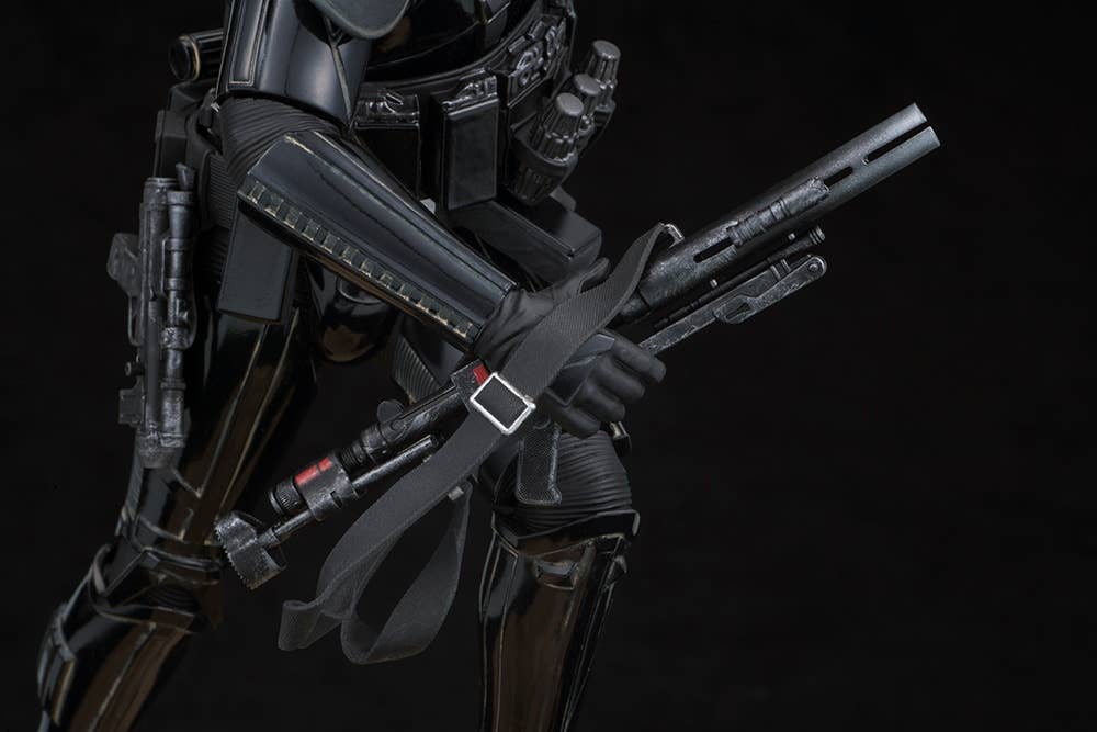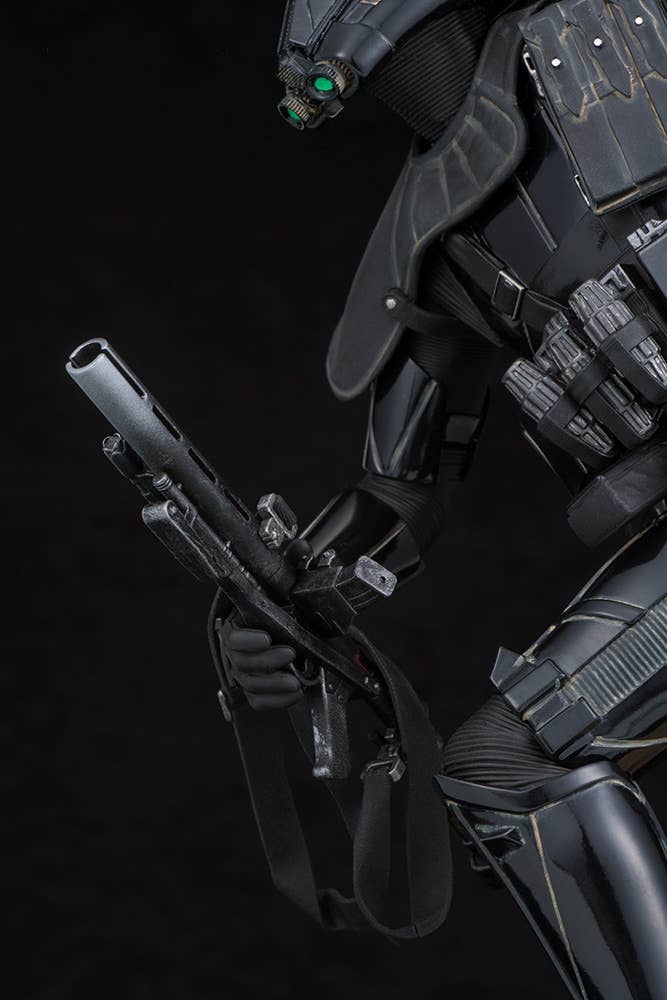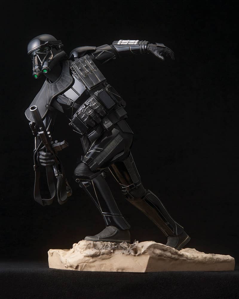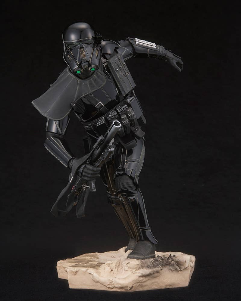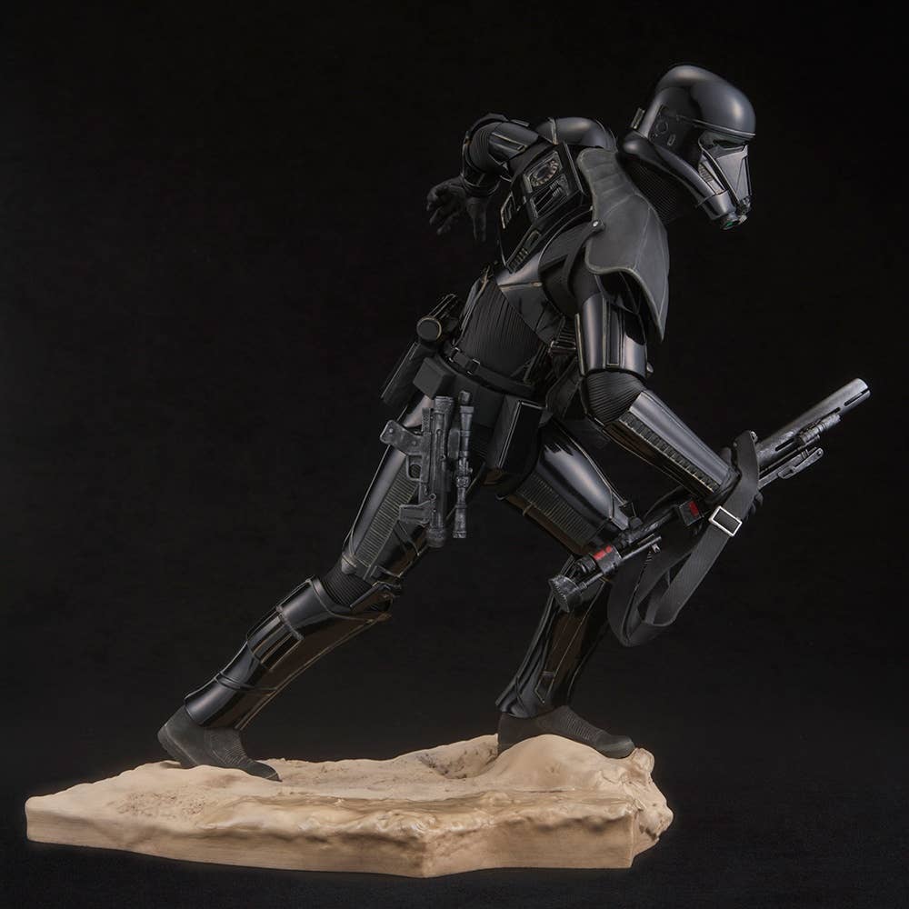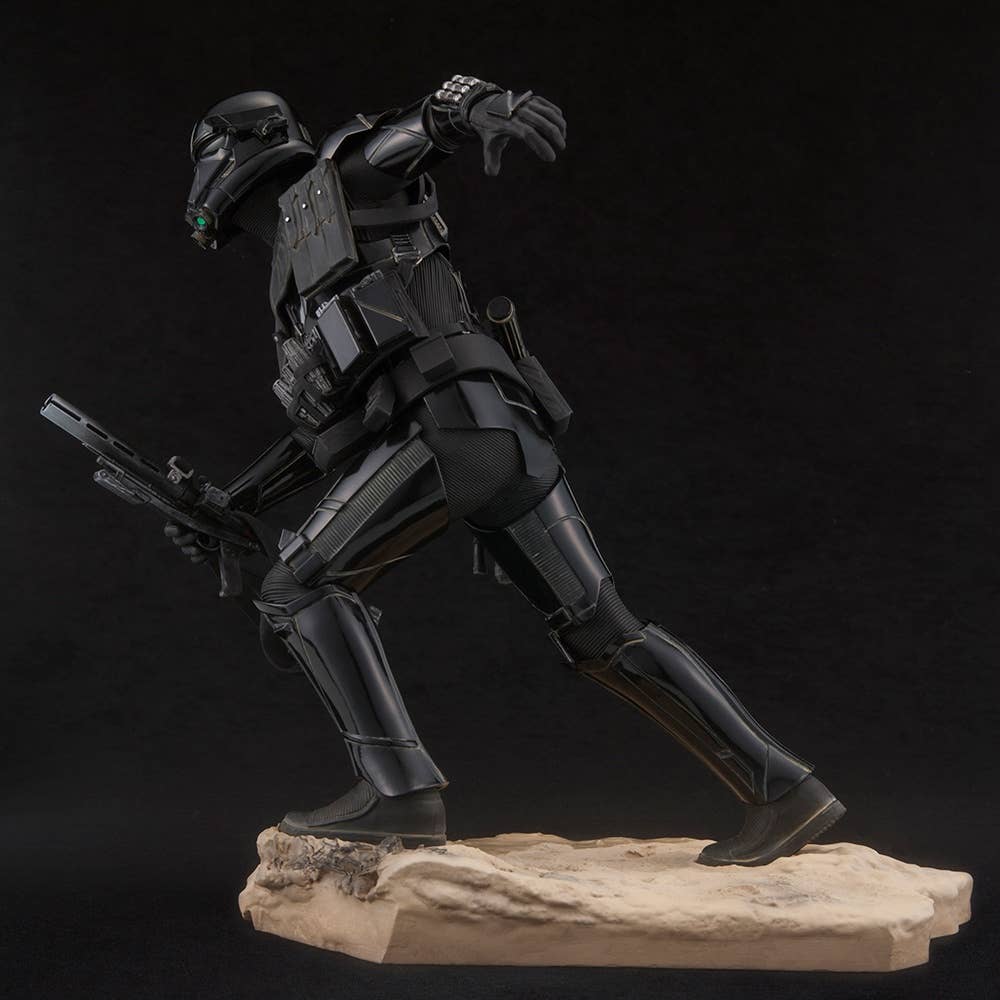 The Death Trooper is displayed in action, charging forward toward the enemies of the evil Galactic Empire. Highly detailed sculpt recreates the armor and weapons as seen on-screen. The Death Trooper stands 24 cm tall, and comes with a base sculpted to resemble combat terrain. The toy Stormtrooper can be carried in his hand, or placed on the base.