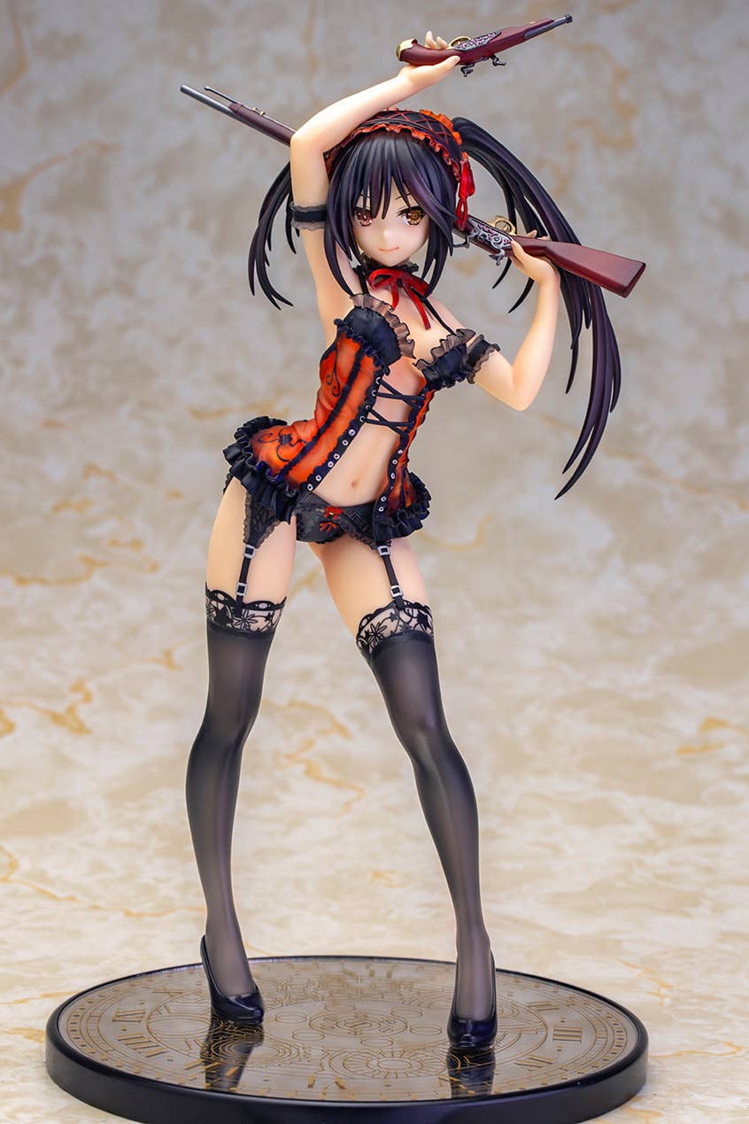 Alpha Max's gorgeous figure of Kurumi Tokisaki from "Date A Live," originally released in 2019, is back! She wears beautifully detailed red-and-black lingerie with frills in all the right places; she brandishes a filigreed rifle and pistol with a confident smile. Her mirrored base resembles a clock face, too! Order her for your own collection today!