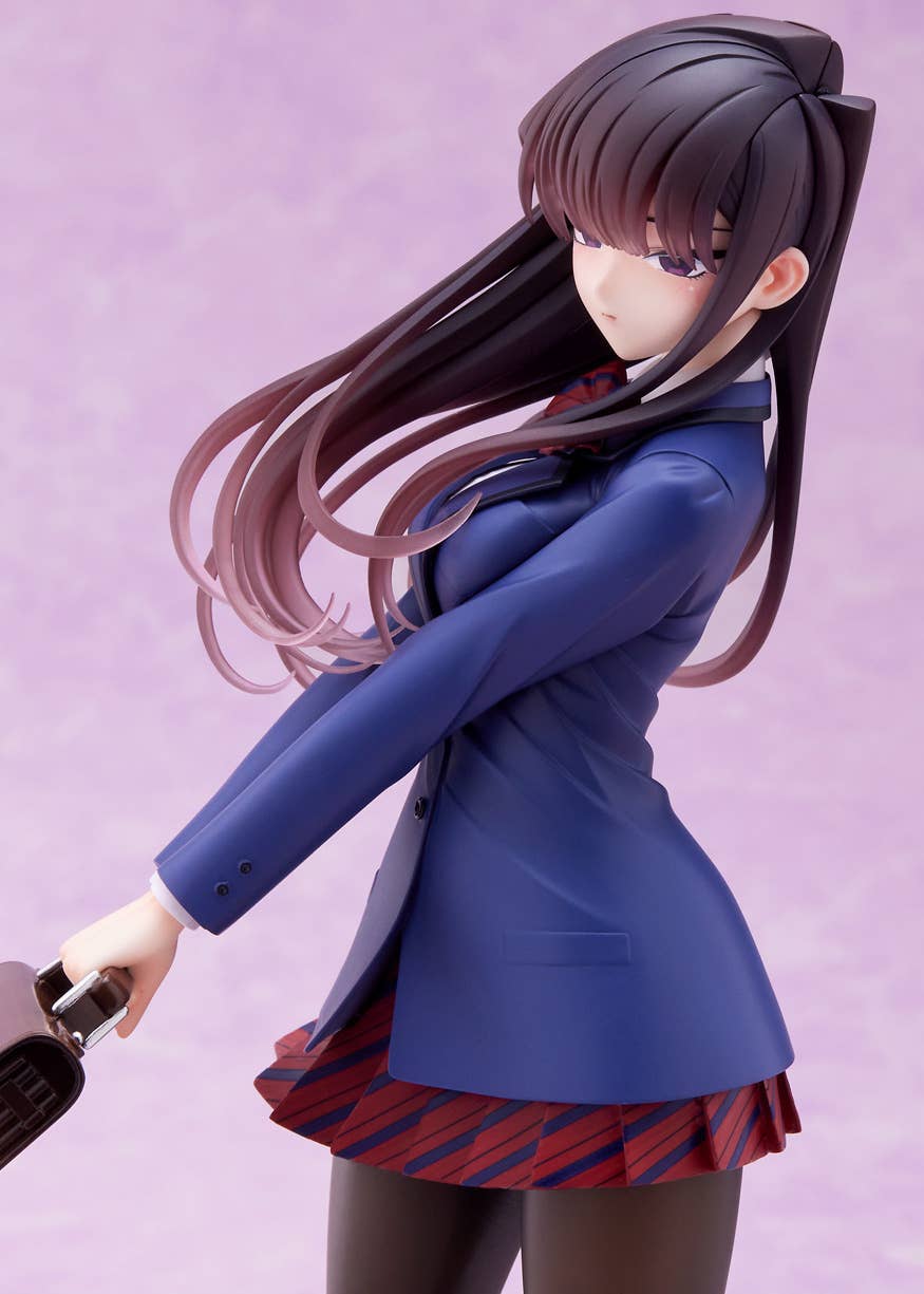 The lovely Komi from "Komi Can't Communicate" gets a new figure from Wave! She pauses on a windy day with her glossy black hair blowing in the wind; she braces herself with one slender leg as a particularly strong gust threatens to tear her book bag out of her hands. The slight wrinkling at the waist of her uniform jacket and the sway of her hair are wonderfully sculpted. Her neck features an "H" joint so the angle of her head can be adjusted, and an adorable "deformed" face from the anime is included too, as is a base. You'll love her -- order her for your own collection today!