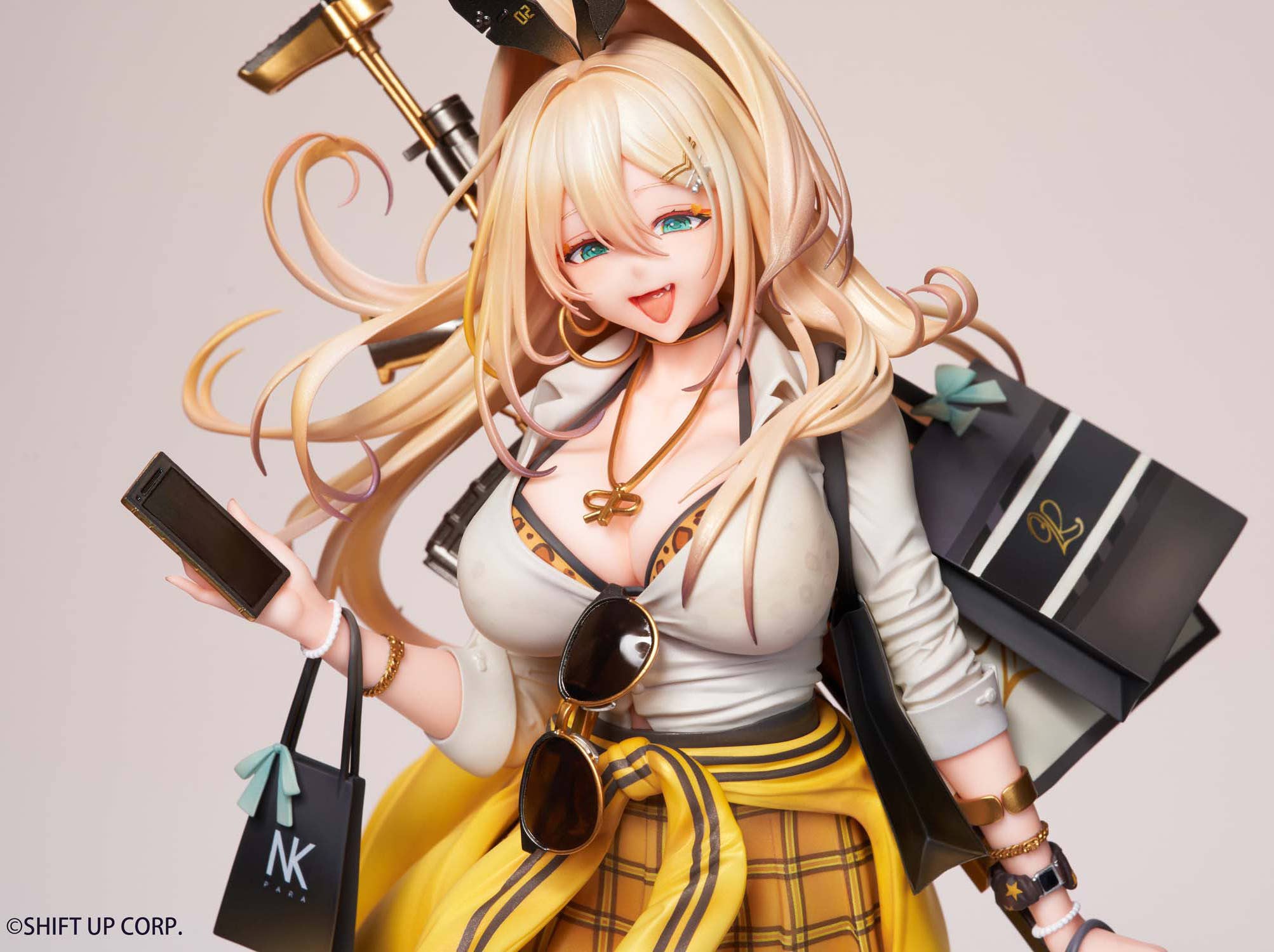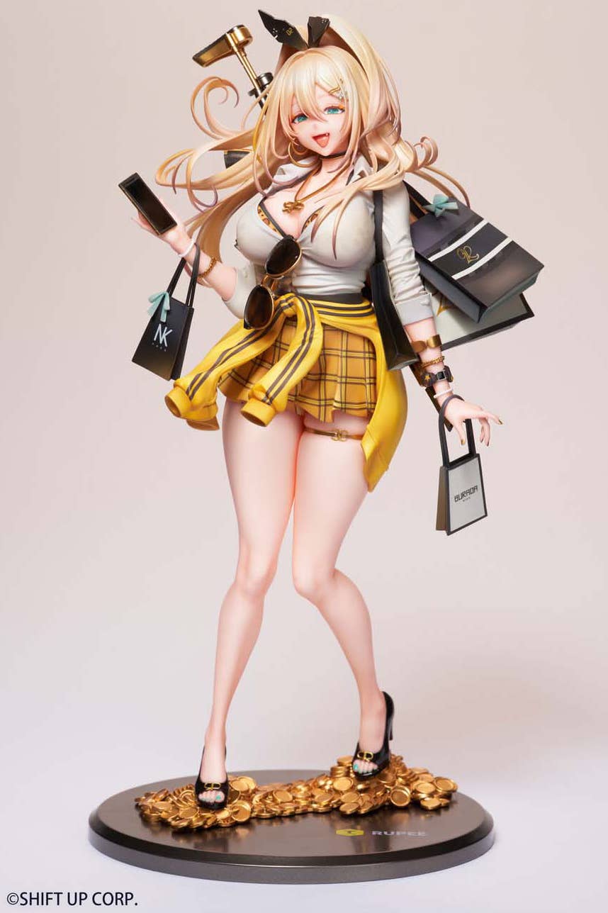 Rupee from the popular smartphone game "Goddess of Victory: Nikke" is now a charming 1/7-scale figure from Hobby Sakura! She looks like she's been shopping, loaded down with shopping bags, and giving you a saucy smile with her tongue showing! She's posed on a pile of golden coins, too, and as a special bonus, you'll receive a full-size collector coin! Her base is included. Order her for your own collection today!