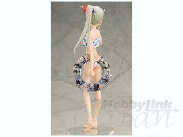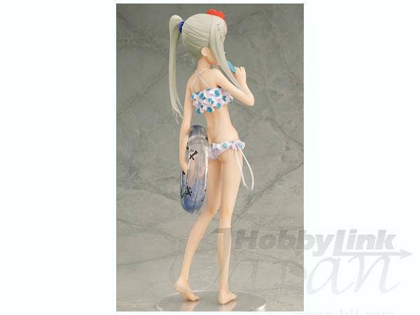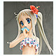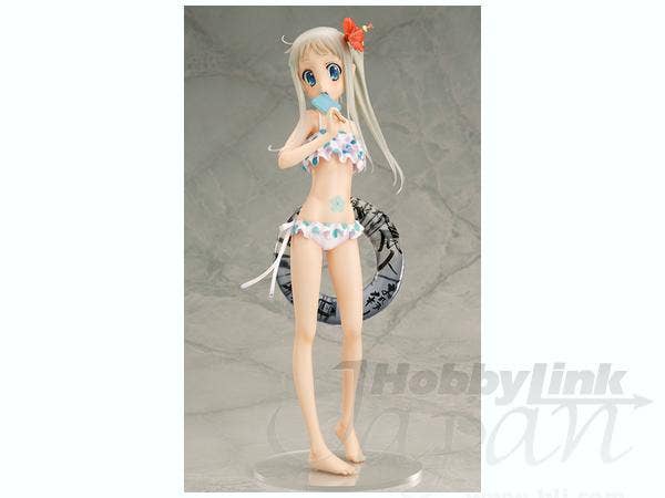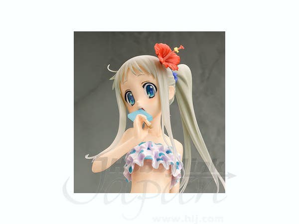 Meiko Honma from "Ano Hi Mita Hana no Namae o Bokutachi wa Mada Shiranai" is all set for a fun day at the beach! Her cute bikini is awash in ruffles and polka dots, and her swim ring is decorated with the "wise words" originally found on Jin-tan's T-shirt. With a colorful flower in her hair and a delicious ice-pop treat to enjoy, she's the very soul of summertime. She's about 24cm tall, and comes with a round base bedecked with blue flowers (not the plain base shown in the prototype photos). This wide-eyed darling is ready to meet you today--order her now!