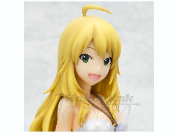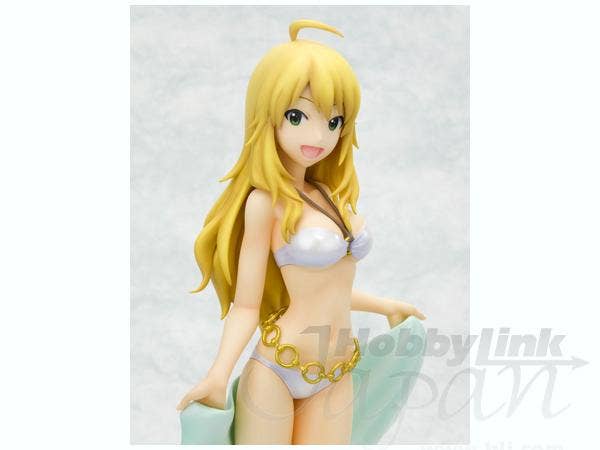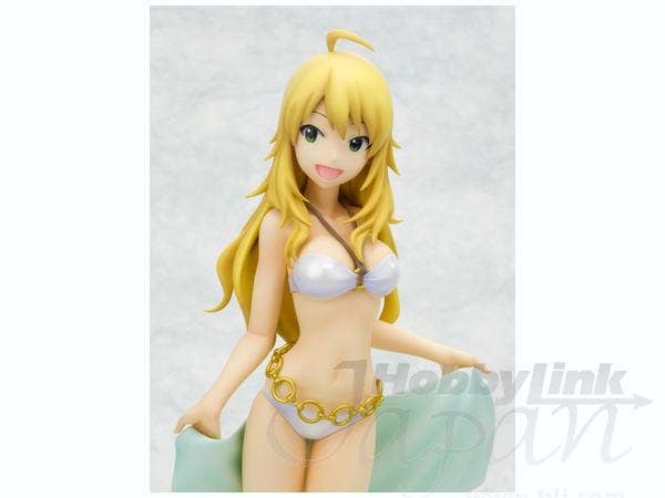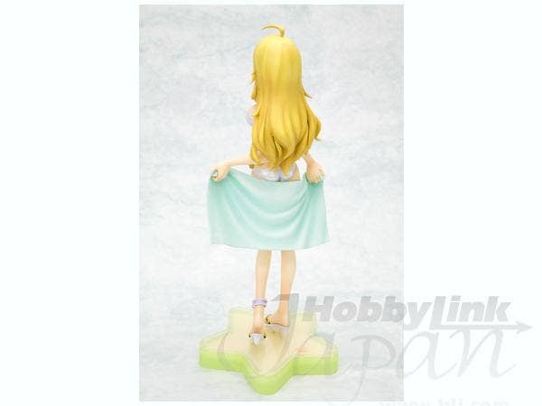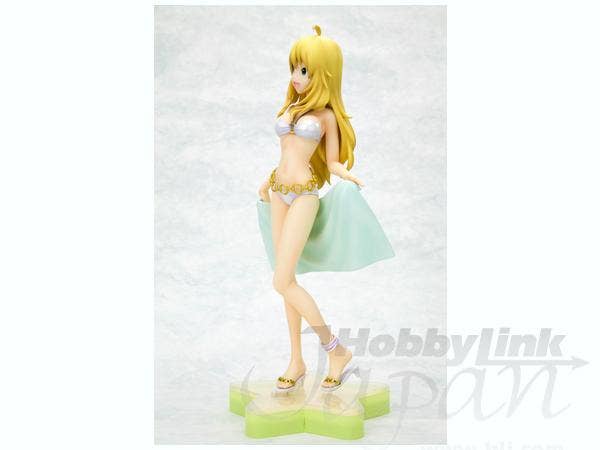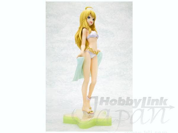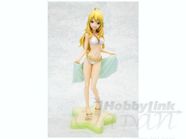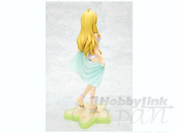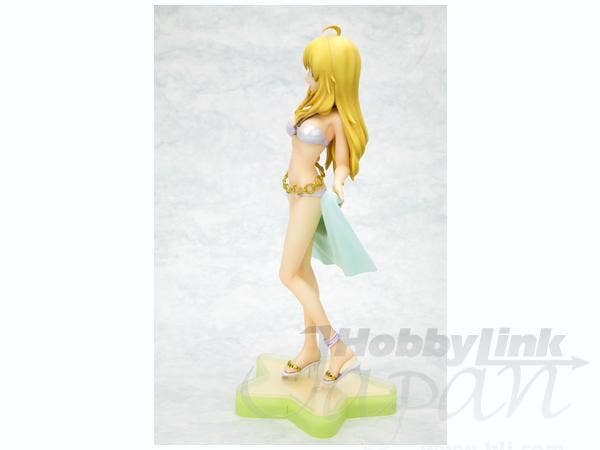 Miki Hoshii from "The Idolmaster" enjoys her stay on the Angelic Island with a white bikini and a broad smile! She holds a sea-green towel behind her with both hands (although she can be displayed without the towel if you wish).  A star-shaped base is included; she's about 25cm tall.  Order her today!