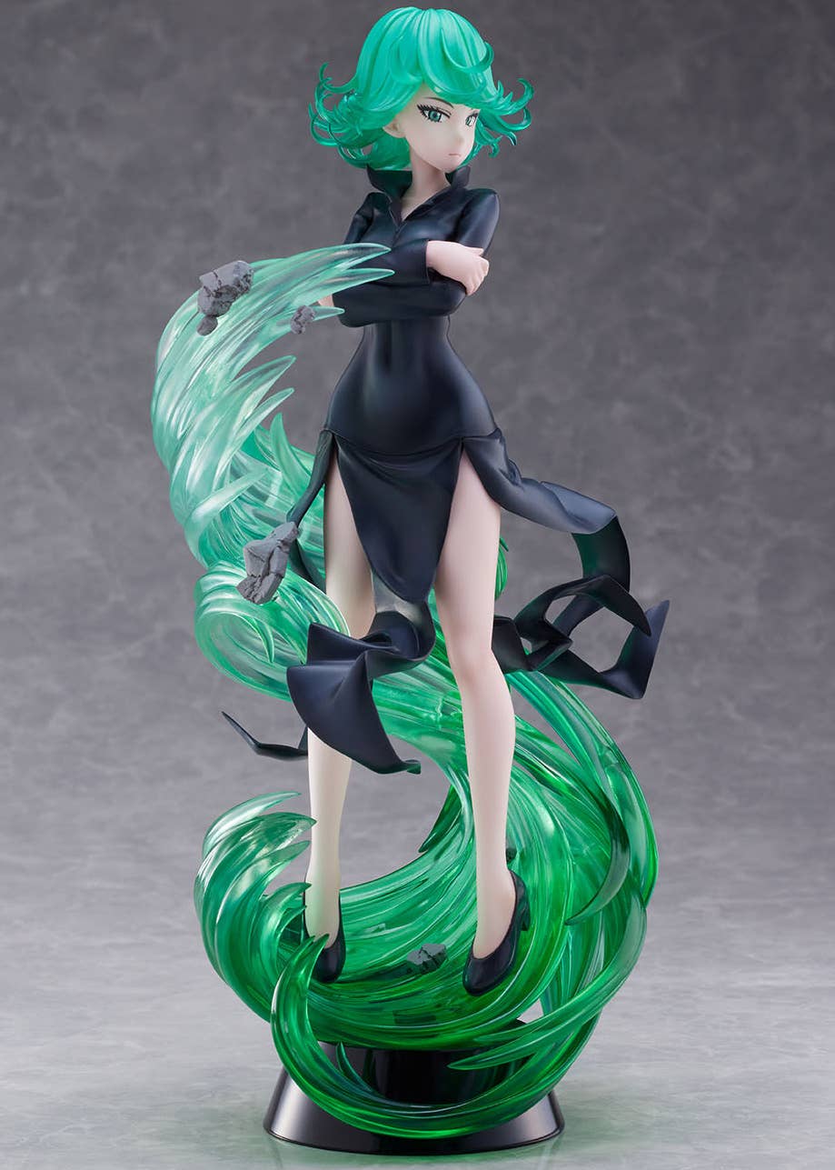 Tatsumaki, also known as the Tornado of Terror from "One Punch Man," is now a beautiful figure from Bellfine! She stands amid a swirling green vortex of power with her arms folded tightly over her chest and a suspicious look in her eyes. The vortex and her hair are made with clear parts for a glowing, slightly supernatural look. Order her for your own collection today!