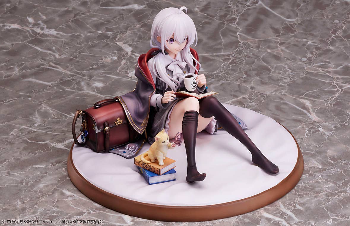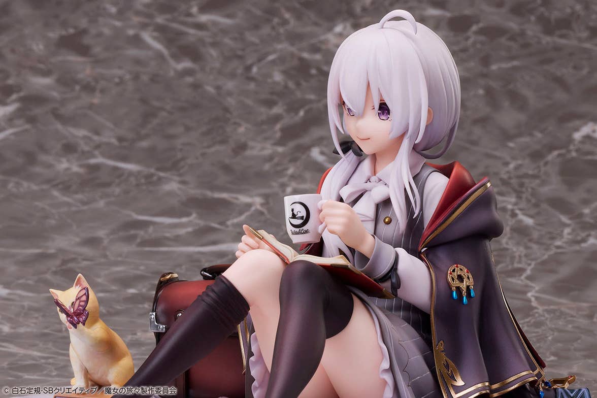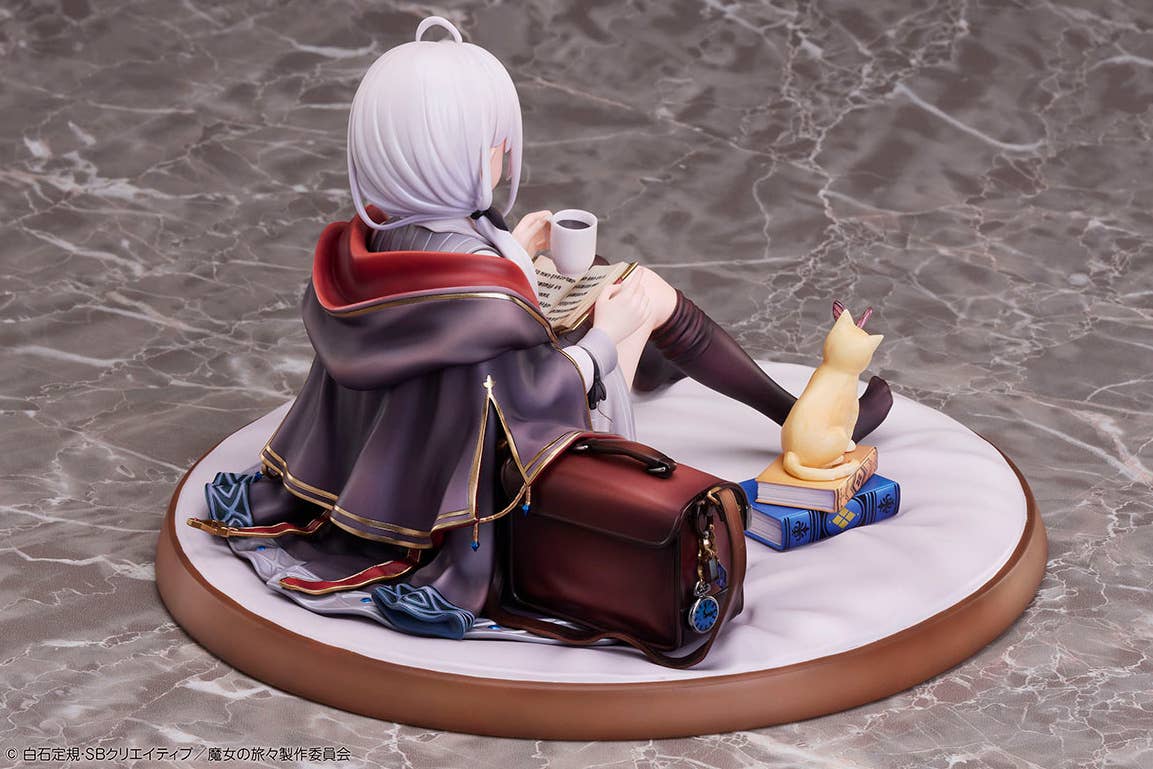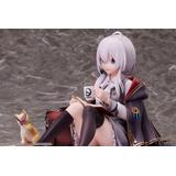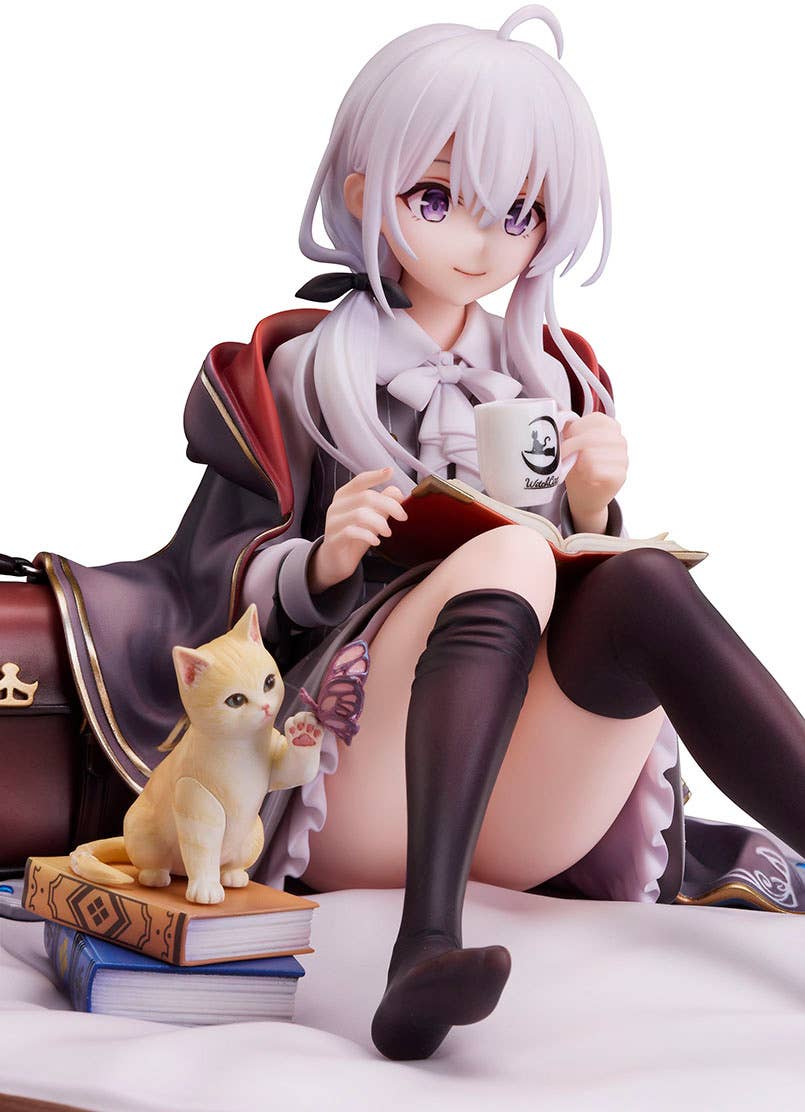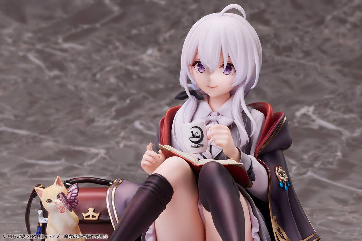 Elaina, the beautiful genius "Ashen Witch" from the TV anime "Wandering Witch: The Journey of Elaina," is now a peaceful figure from Design Coco! This figure is based on an illustration by Azuru; it perfectly captures her distinctive gray hair, her relaxed smile, and her outfit, as well as her bag and stack of books. A cute kitten is seated nearby to keep her company, and she comes with a base that resembles a soft cushion. This figure would look great displayed in your own library -- order her today!