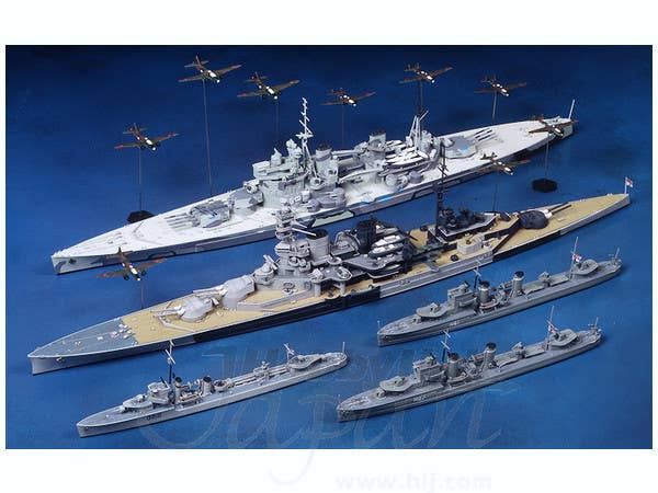 This set of ships and aircraft from Tamiya includes five of the ships of Force Z, the fleet entrusted to guard the waters south of the Malay Peninsula. The lineup of Tamiya's waterline models includes the British battle cruiser Repulse, the British battleship Price of Wales, the Royal Australian Navy destroyer Vampire, and the British E-class destroyers Electra and Express. The set also includes ten Type 1 "Betty" and nine Type 96 "Nell" attack bombers, the aircraft responsible for sinking the British warships. Bases with metal support rods are included for each aircraft.