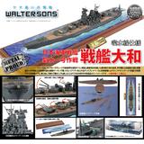 This is a completed and painted model of the Japanese battleship "Yamato" in Kikusui No. 1 operation paint scheme and waterline specification. The model comes with a sea surface diorama base and can be enjoyed as is in a window package. The box is made of ABS resin frame for strength. The nameplate of "Yamato" that can be connected to the base is included. The model features meticulous paint and ultra-precise tampon printing. It also has a realistic weathering finish that is a trademark of the Metal Plated series. The lower part of the hull (red-brown part) is made of die-cast metal for added weight. The hull has four roller bearings embedded in the bottom surface, allowing it to be lightly pushed and slid with a finger. The main and secondary gun turrets can rotate left and right, and the main gun barrels can move independently. The secondary guns can move in unison in groups of three. Two onboard aircraft come with the model, and the catapult and crane can move. The model and base are easy to detach and store with a peg fixing method that simply rotates.