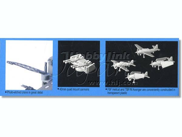 Dragon's Belleau Wood kit is sharply molded in light gray and clear styrene, with two comprehensive frets of photo-etched detail parts and beautiful decals by Cartograf. The ship's air wing of F6F Hellcats and TBF/M Avengers is molded in clear plastic.