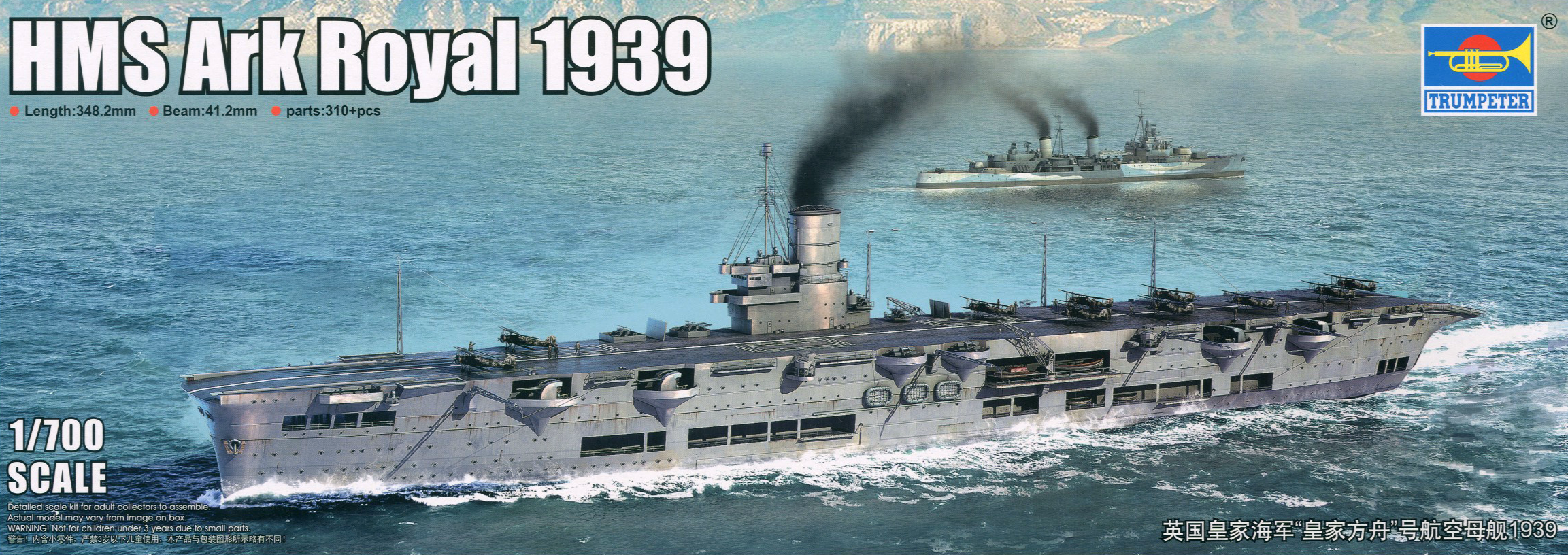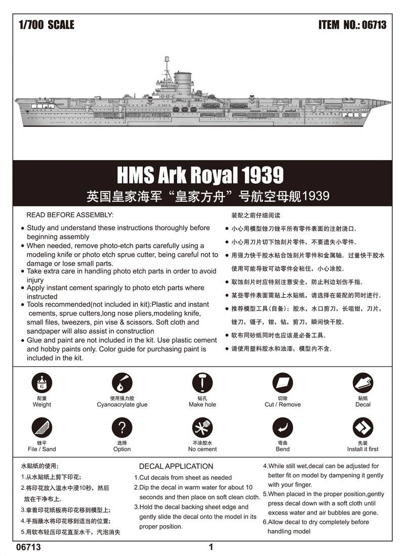 This Plastic Model Warship Kit contains 18 sprues and deck piece, 1 photo etched sheet, display stand and engraved name plate and three aircraft: Swordfish , FULMAR MK1 & Blackburn SKUA