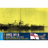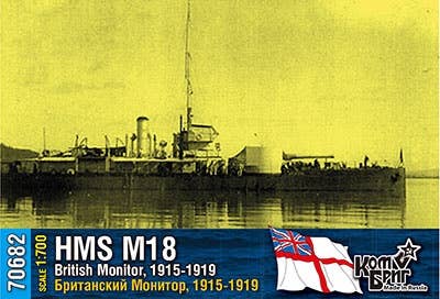 The British M15-class monitor ship M18 was ordered under the Wartime Emergency Shipbuilding Program in 1915. She was completed in July of that year; she was a monitor ship for coastal artillery designed with the assumption that the armament equipped would be a 9.2-inch gun for cruisers. She was later equipped with another 12-pounder gun and a 6-pound anti-aircraft gun. She had a hot-bulb engine with 640 horsepower, capable of speeds up to 11 knots. She was active in the Mediterranean from 1915 to 1918, and in the Baltic Sea in 1919; she was sold and dismantled in 1920.