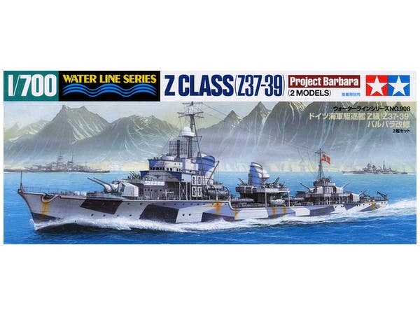 The German Z Class destroyers were deployed from 1935 to 1944, serving off the coast of Norway and acting as escorts for the famous German Heavy Cruiser Scharnhorst. Tamiya has reissued its nice Z Class German Destroyer kit with some new parts to build early-war or "Project Barbara" late-war boats with added air defense armament. Includes 2 complete ship kits in 1/700 scale.