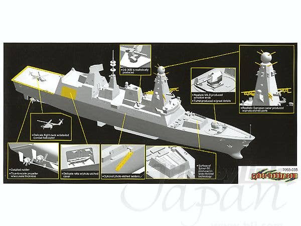 Dragon/Cyber-Hobby's detailed kit of the British Type 45 Destroyer Daring features super-sharp moldings and includes photo-etched metal parts for the utmost in detail. Decals by Cartograf.