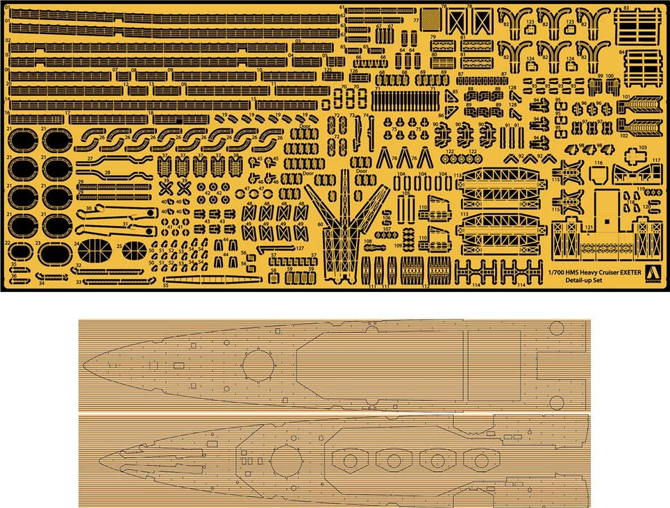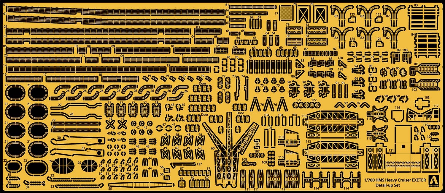 This is a set of photo-etched metal detail parts as shown here for the 1/700 Aoshima HMS Exeter.