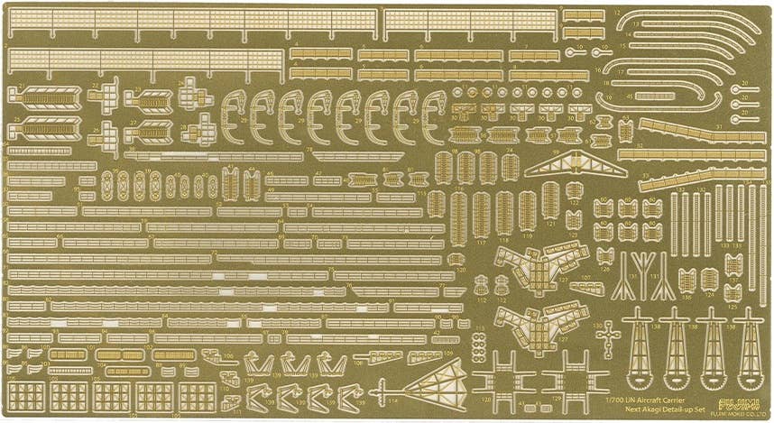 Photo-etched parts are included for the rail, fall prevention, jack stay around the chimney, lifeboat davits, fixed mast, wireless mast, chimney exit and exterior, ship ladder, ramp, landing boat lights, etc.
