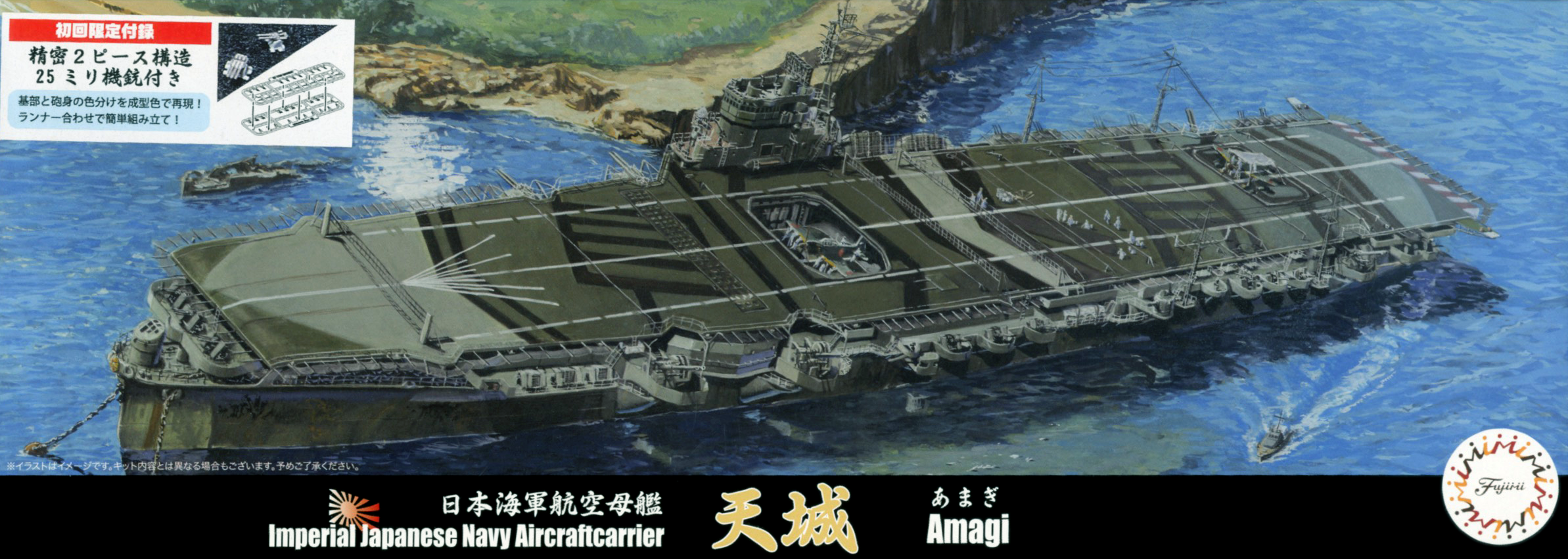 This waterline kit of the aircraft carrier Amagi includes special parts to reproduce its extended rear bridge! The ship's form has been simplified to shorten construction time, yet the kit is still loaded with detail. Four types of aircraft are also included, as are decals to reproduce the markings on the flight deck.