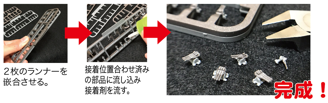 This item requries the use of cement (glue) to complete. For injection-plastic kits, use the weld-type clear cement specifically designed for use on styrene plastic. For some smaller parts, you may wish to use instant type (cyanoacrylate) glue. For resin, white metal, soft vinyl and photo-etched materials, the use of instant type cement is strongly recommended.