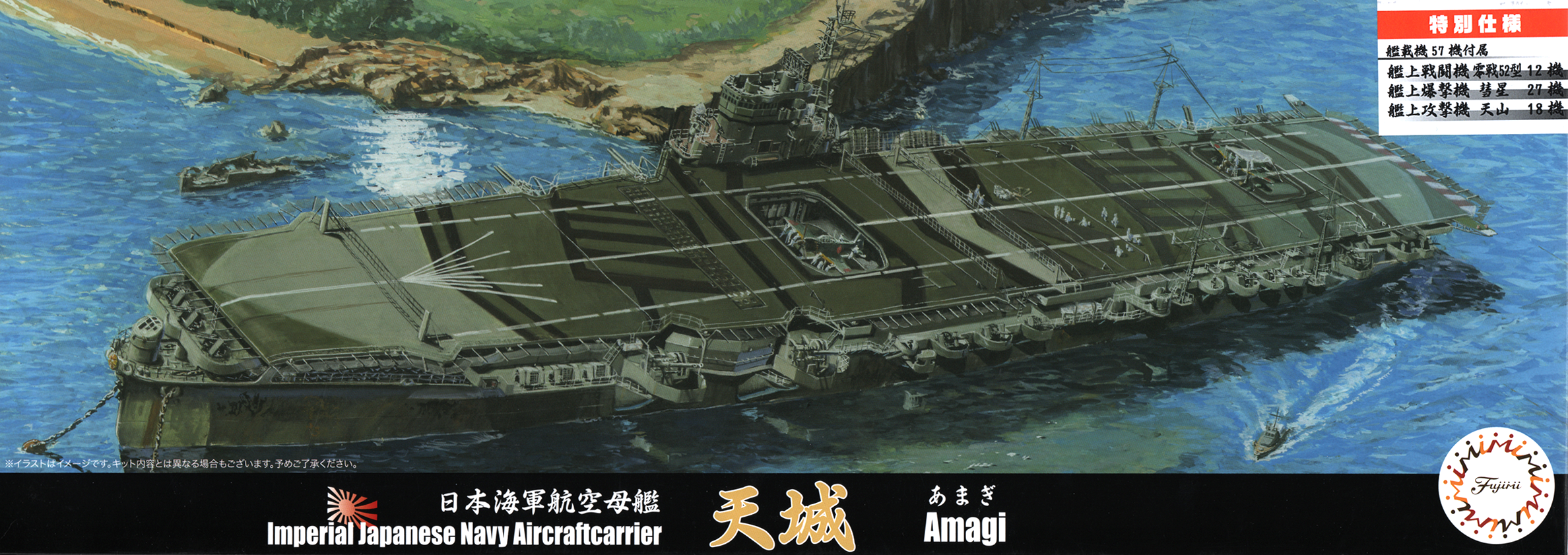 This special version of Fujimi's kit of the IJN aircraft carrier Amagi comes with a big complement of on-board aircraft: 12 Zero fighter 52s, 27 Suisei bombers, and 18 Tenyama attack aircraft! It's modeled in great detail, and includes decals to reproduce the camouflage pattern on the flight deck. Order yours today!