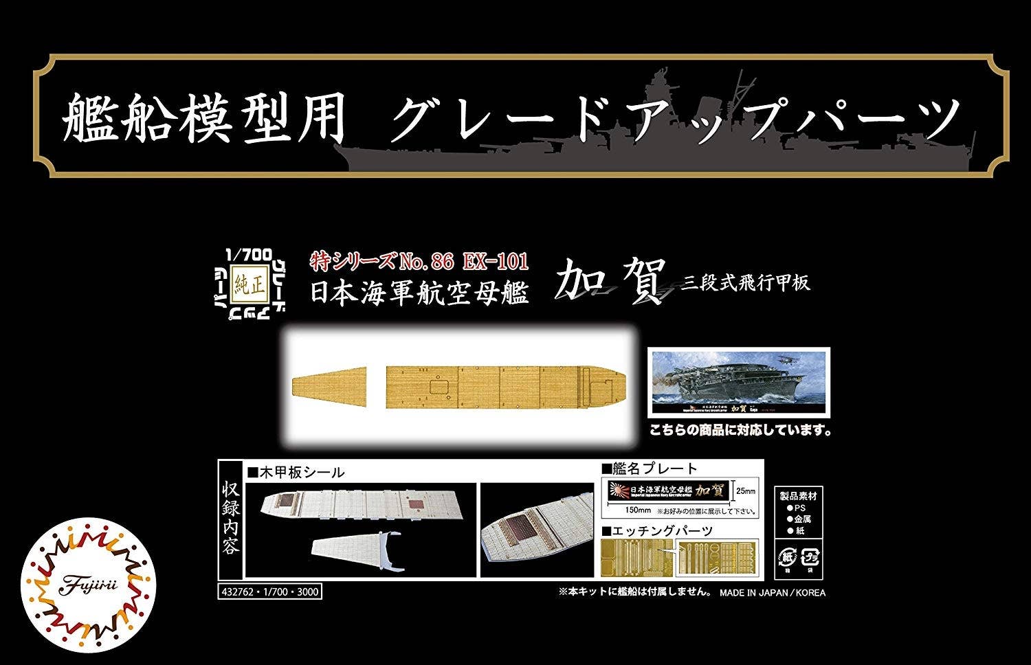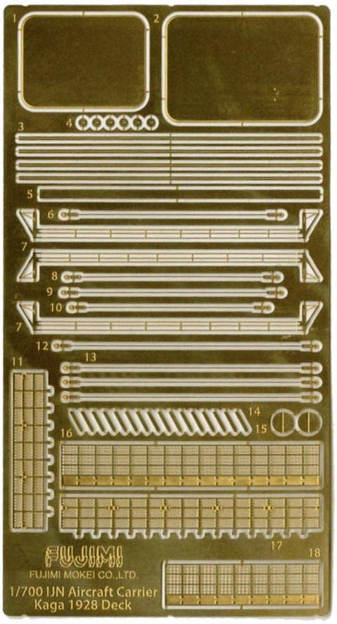 A set of wooden deck stickers and photo-etched parts for detailing the Fujimi 1/700 scale IJN Kaga. Includes a name plate for display.