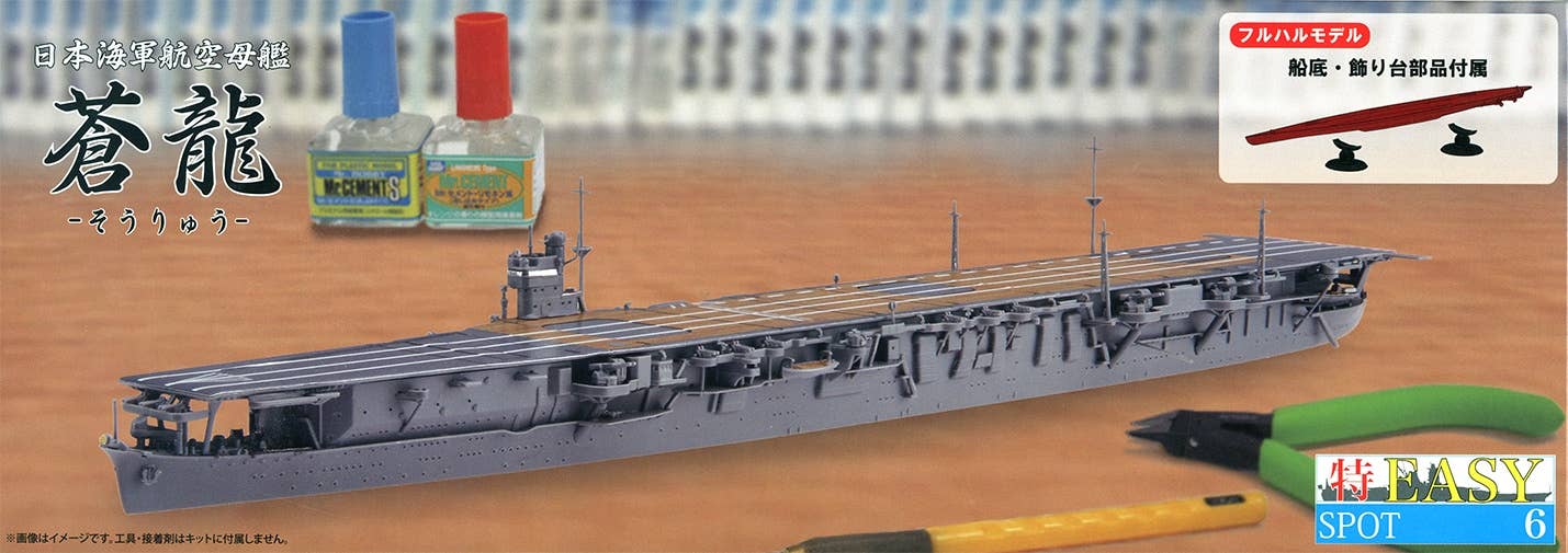 This kit builds into a full-hull model of the aircraft carrier Soryu. Molded in gray, black, dark green and red plastic; includes parts for a base and foil stickers for the markings.