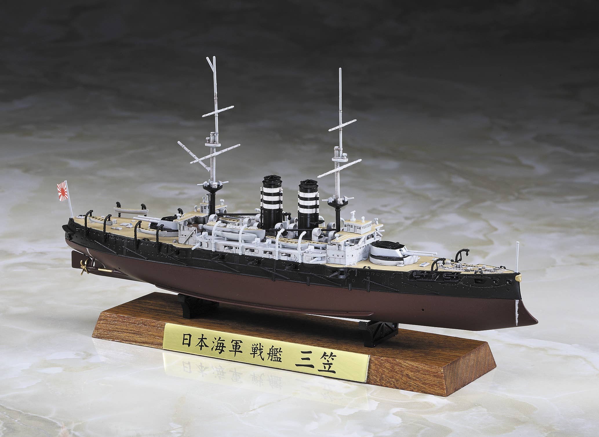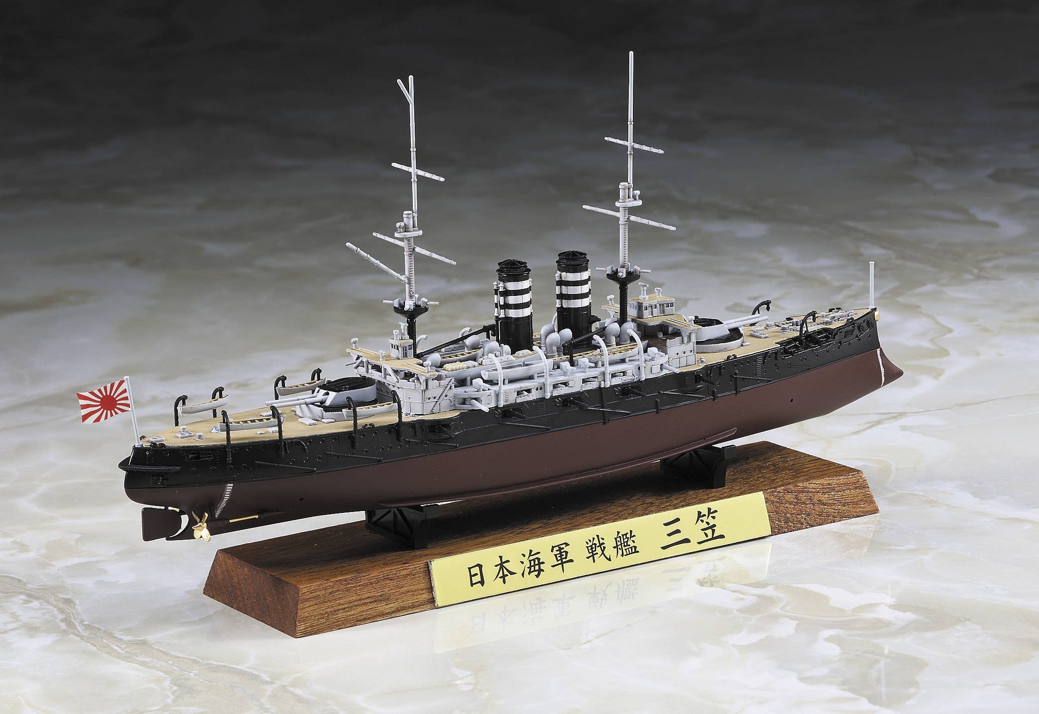 Few ships are as storied as the legendary Mikasa. This pre-dreadnought battleship took on the Russian fleet the Battle of Tsushima. This clash shocked the whole world and revealed Japan as the Pacific's dominant naval force. There's such reverence for this vessel in naval circles that it is still on display over 100 years after it was commissioned. This limited edition kit features a metal name plate, wooden display stand parts and markings that commemorate the Mikasa's completion in 1902.