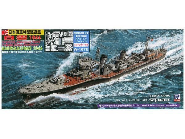 This highly detailed 1/700-scale injection plastic kit of the Imperial Japanese Navy destroyer Shirakumo can be built as either a full-hull or waterline model. Decals are included for the Shirakumo and its three sister ships, the Usugumo, the Isonami, and the Uranami. Includes a nice display stand with nameplate (nameplate to be cut from the box).